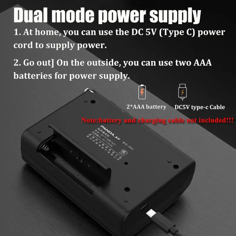 DC: 5V---0.5A(USB-TypeC cable not included!!!),2*AAA battery