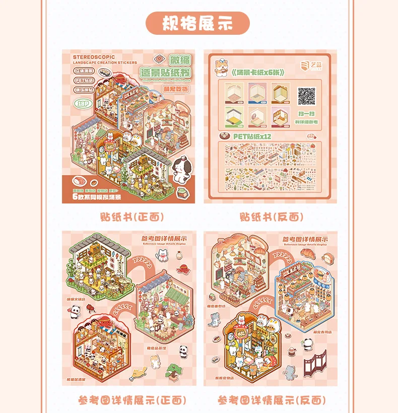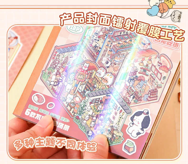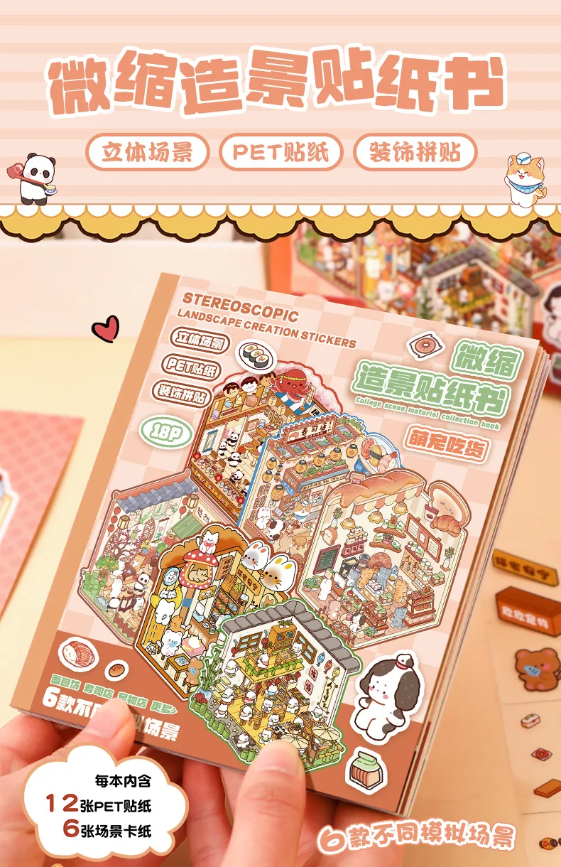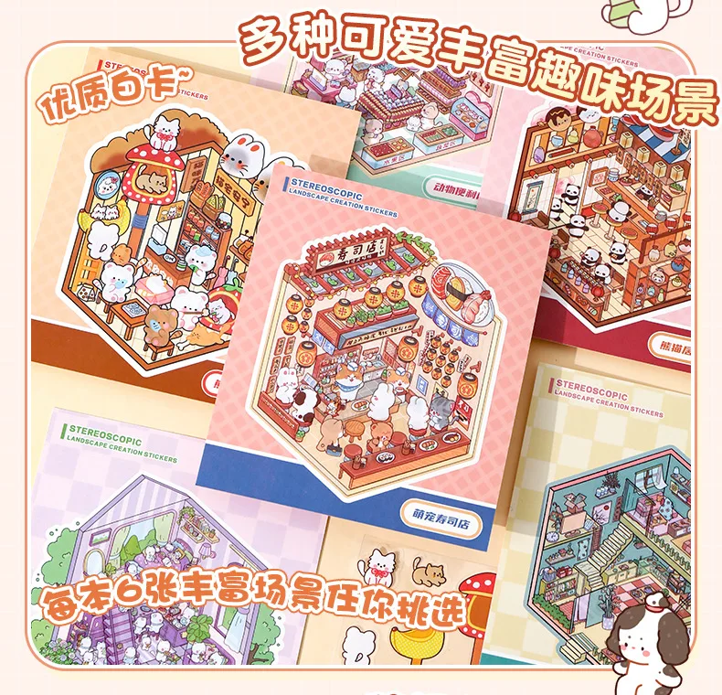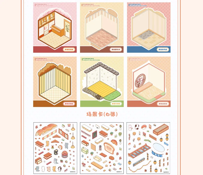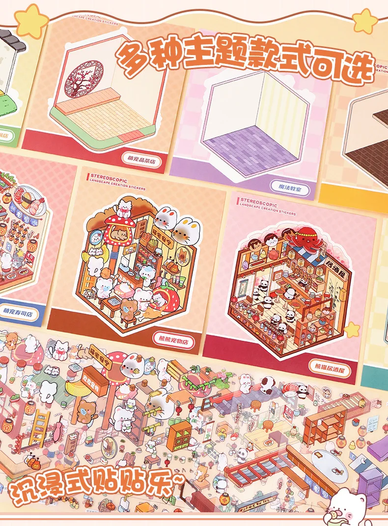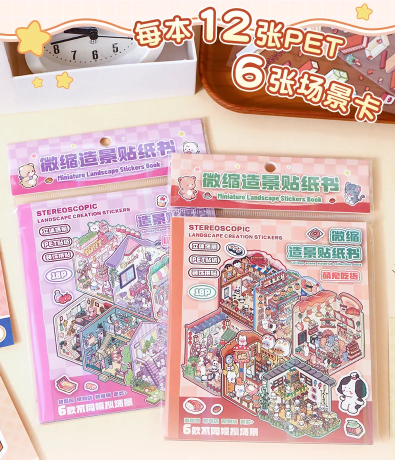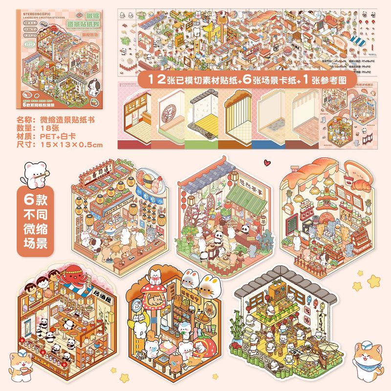 Mini Size 6in1 Cartoon Store Landscape Sticker Collection 2D Scene DIY Toy Game Book Festival Birthday Gift for Kid Child Girl