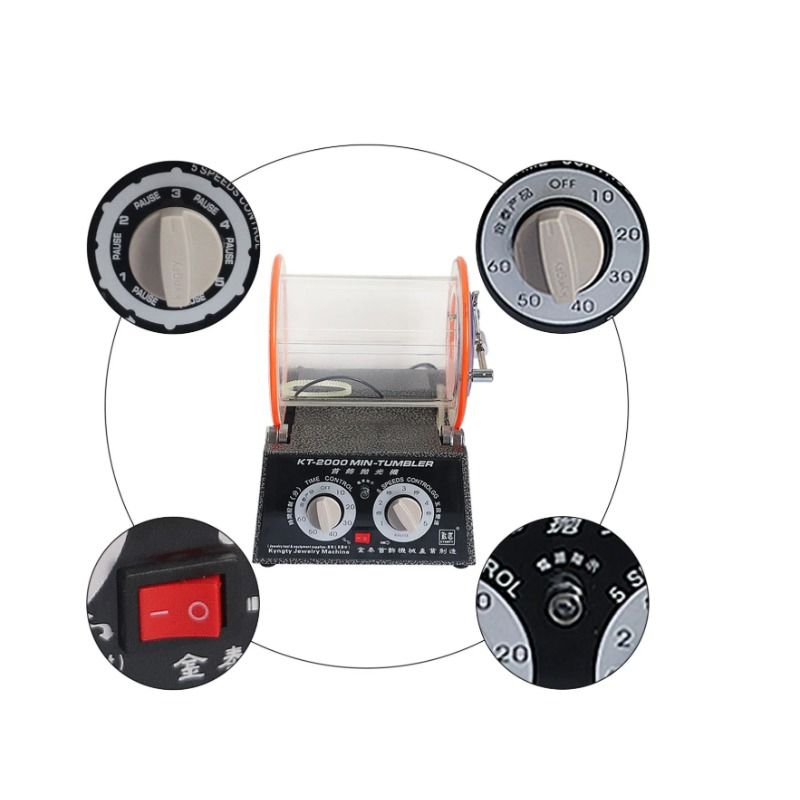 Mini jewelry polisher tumbler with 5 speeds & timer from 10-60 minutes. Excellent for studio and small jewelry projects.