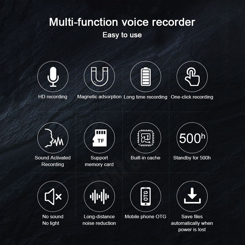 Turn on the Sound Activated Recording function, the sound is greater than 30 decibels to start recording, the sound is less than 30 decibels, the recorder stops recording, helping you save power and memory.