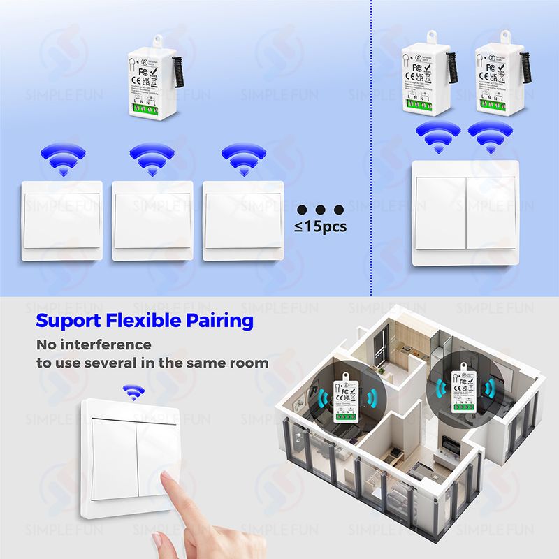 Multiple sets of products can be used at the same location without interfering with each other. One receiver can be used with multiple self-generating wireless panel switches,making it easy to control your devices from different locations.
