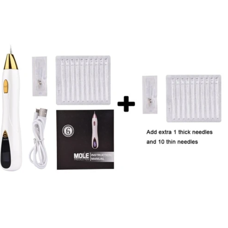 Mole spot removal pen*1, thick needle*3, needle cover*1, fine needle*10, USB charging cable*1, English manual*1, English color box*1