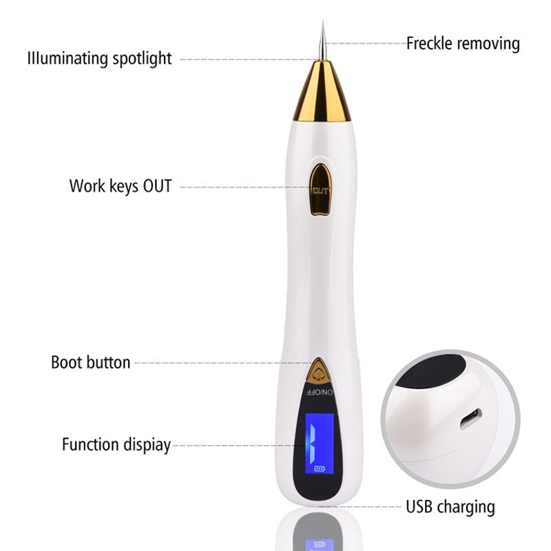 Mole spot removal pen*1, thick needle*3, needle cover*1, fine needle*10, USB charging cable*1, English manual*1, English color box*1