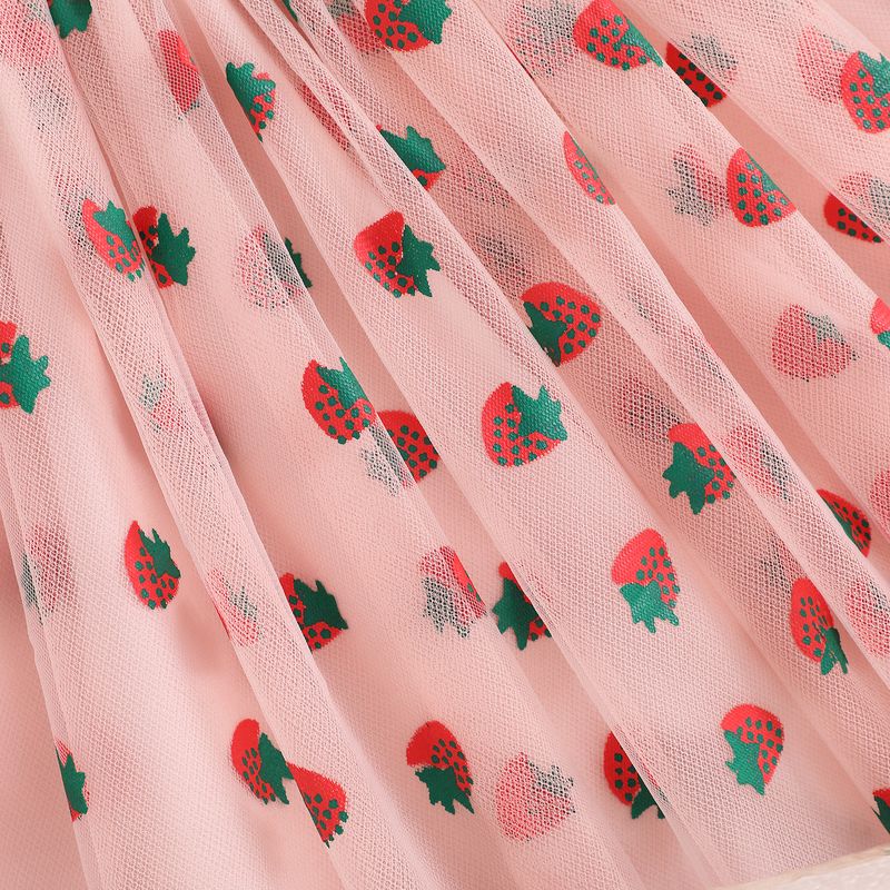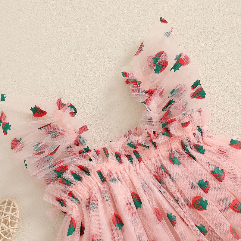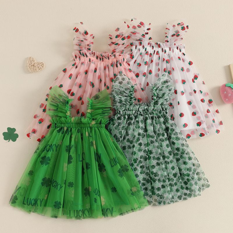 MISOWMNJOY Summer Baby Girls Chiffon Dresses Princess Sleeveless Clover Strawberry Print A-line Dress Mesh Tulle Kids Sundress