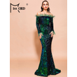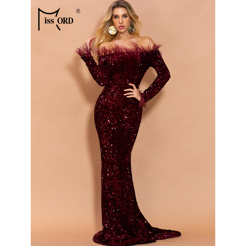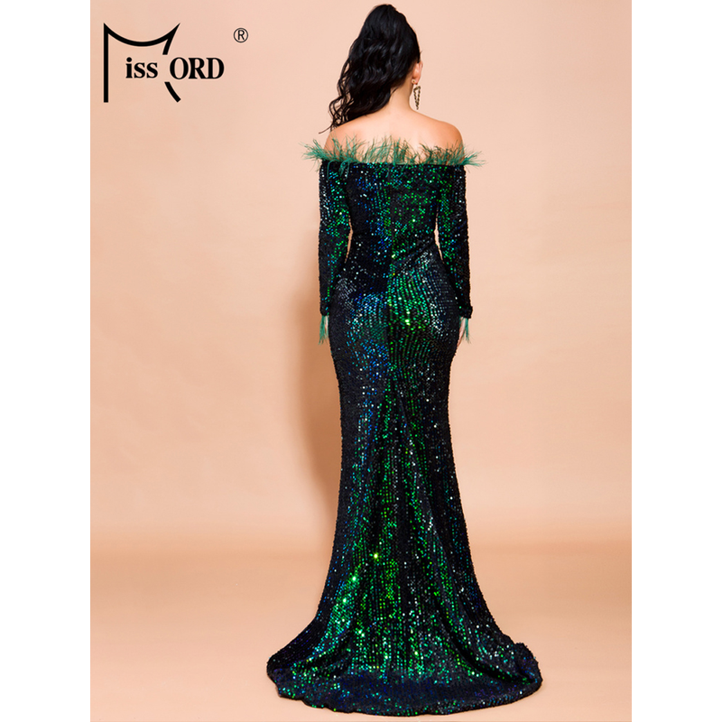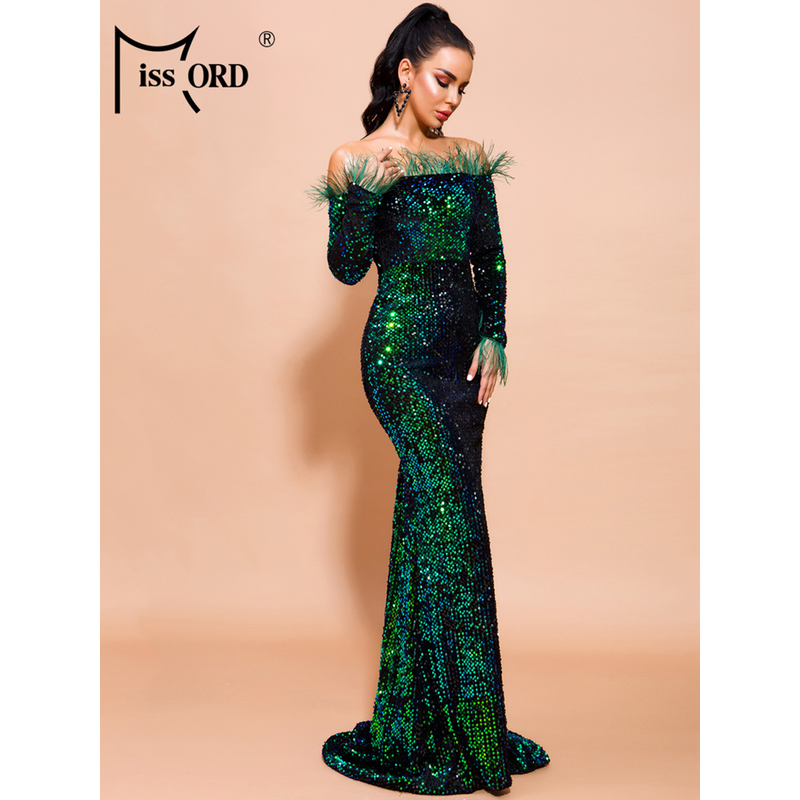 Missord Green Sequin Evening Dresses Elegant Women Off Shoulder Feather Long Sleeves Bodycon Maxi Mermaid Party Prom Dress Gown