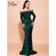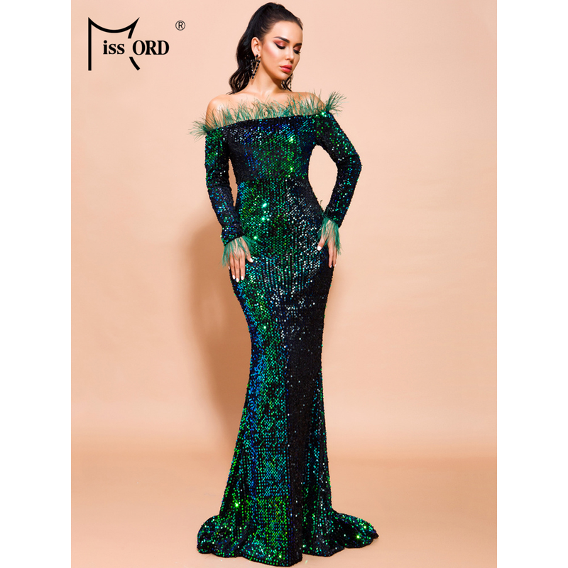Missord Green Sequin Evening Dresses Elegant Women Off Shoulder Feather Long Sleeves Bodycon Maxi Mermaid Party Prom Dress Gown