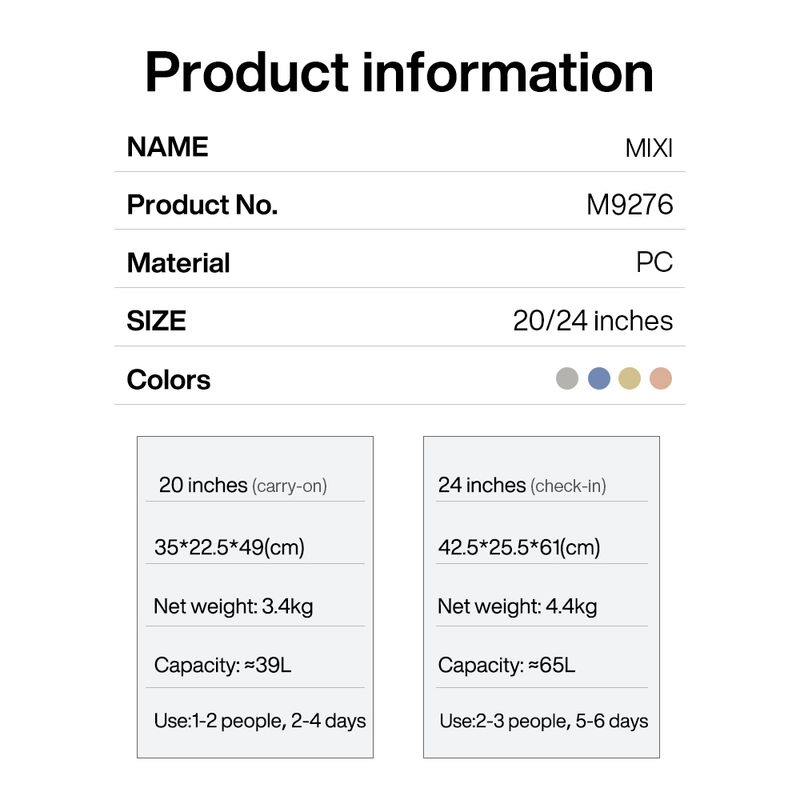 Mixi Wide Handle Travel Luggage Suitcase Rolling Spinner Wheels Hardside PC TSA Lock 20 24 Inch Unisex