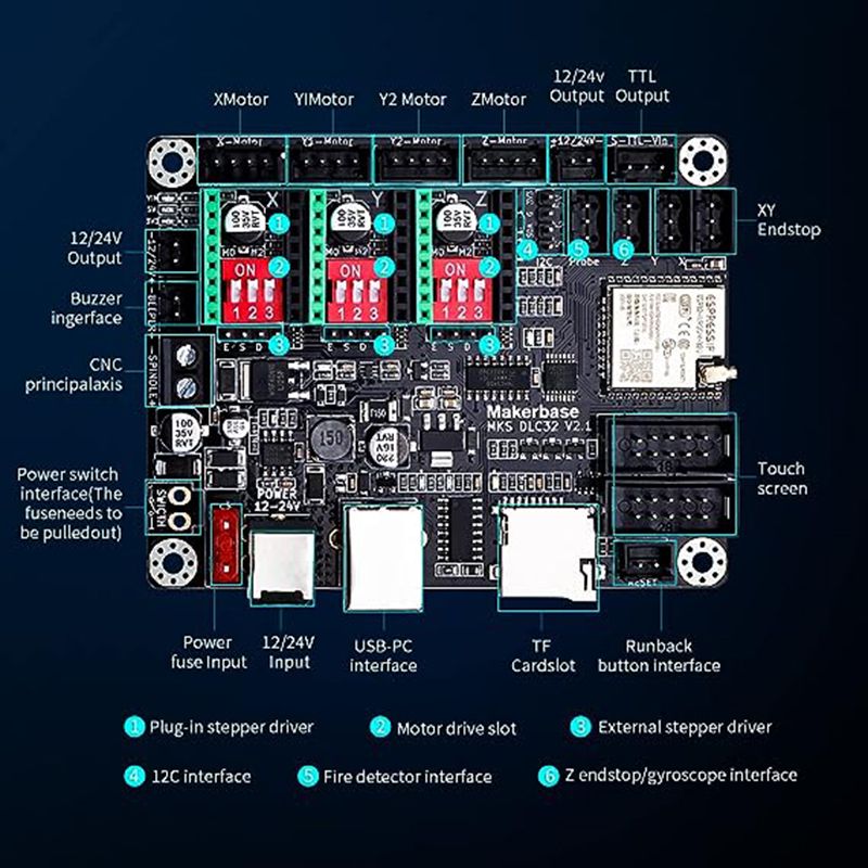 Makerbase laser CNC engraver machine control board can be used on all the desktop laser CNC engraver for homeuse. The MCU ES which is built-in ESP32-WROOM-32U 32 bits DOWD-V3 chip, support clock frequency up to 240MHZ. 8192KBytes flash and 520KBytes ram DC12v/24v powerinput.