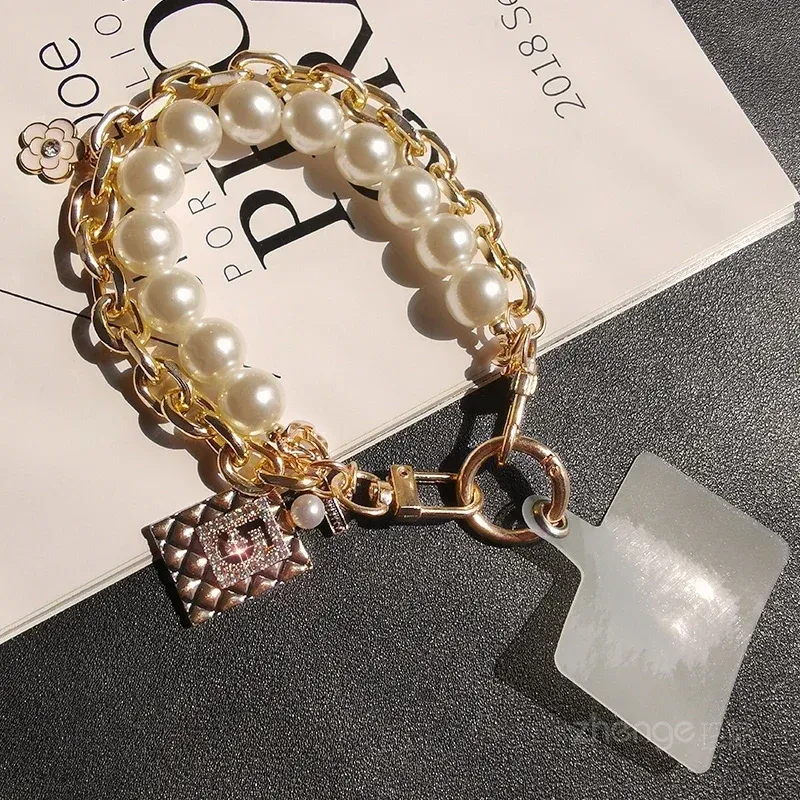 Mobile Phone Lanyard No. 5 Hanging Tag Pearl Double Chain Short Wrist Strap Women's Handmade Pearl Chain Clip Universal Strap