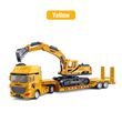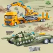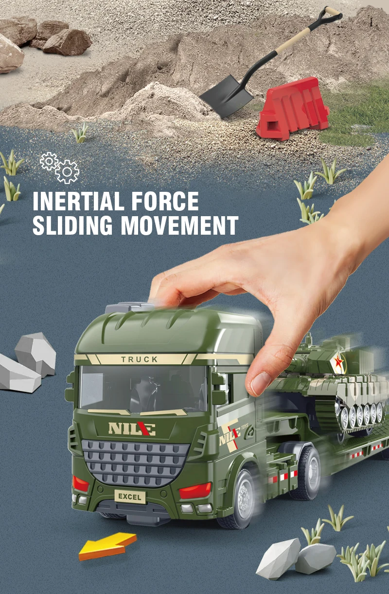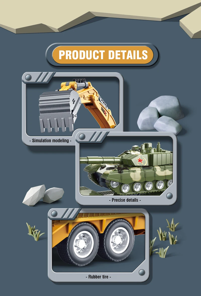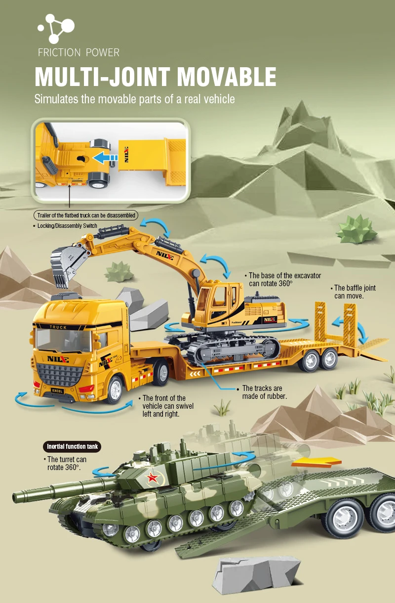 2. The multi-joint of the engineering vehicle is movable. The pallet of the flatbed truck can be disassembled and locked. The base of the excavator can rotate 360 degrees. The front of the truck can turn left and right and swing. The joint of the baffle is movable