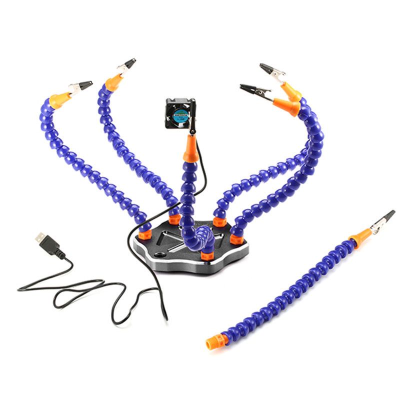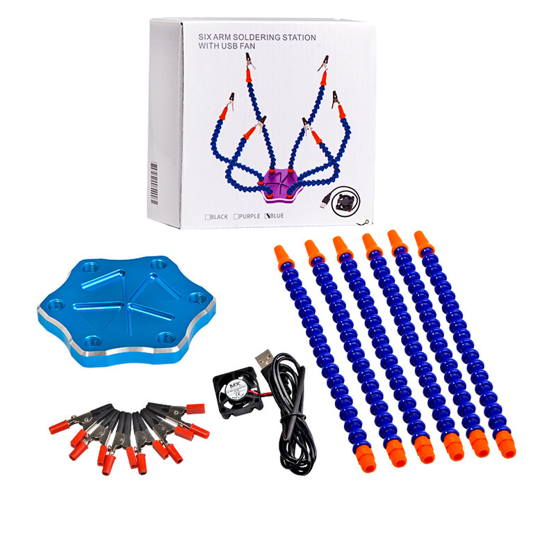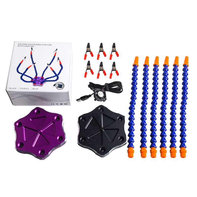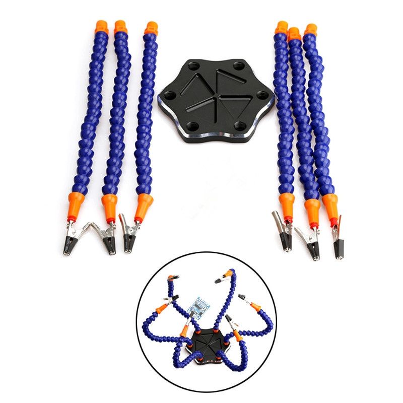 The bottom layer is non-slip, and the soldering station is aluminum, so it won't slip. Multi-function tool table, 6-arm multi-purpose, suitable for model aircraft plugs, flight control of flying aircraft, etc., can help you complete various complex welding. At the same time, the large piece of all-metal used in the bottom plate, only the bracket can be bent arbitrarily, which can be easily Clamp up any object waiting to be welded, the head chuck can also be rotated 360 degrees at will, and the internal groove can accommodate various screws and materials required for welding.