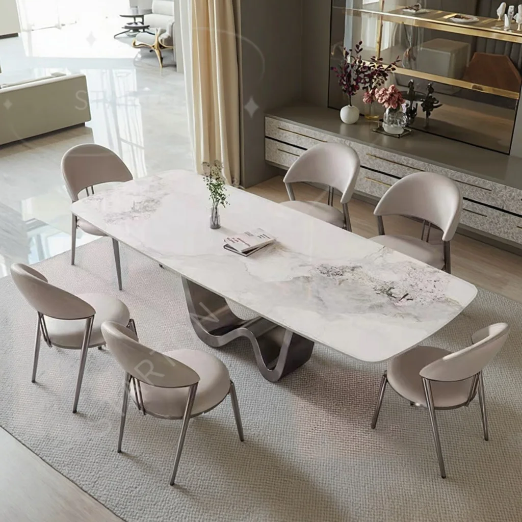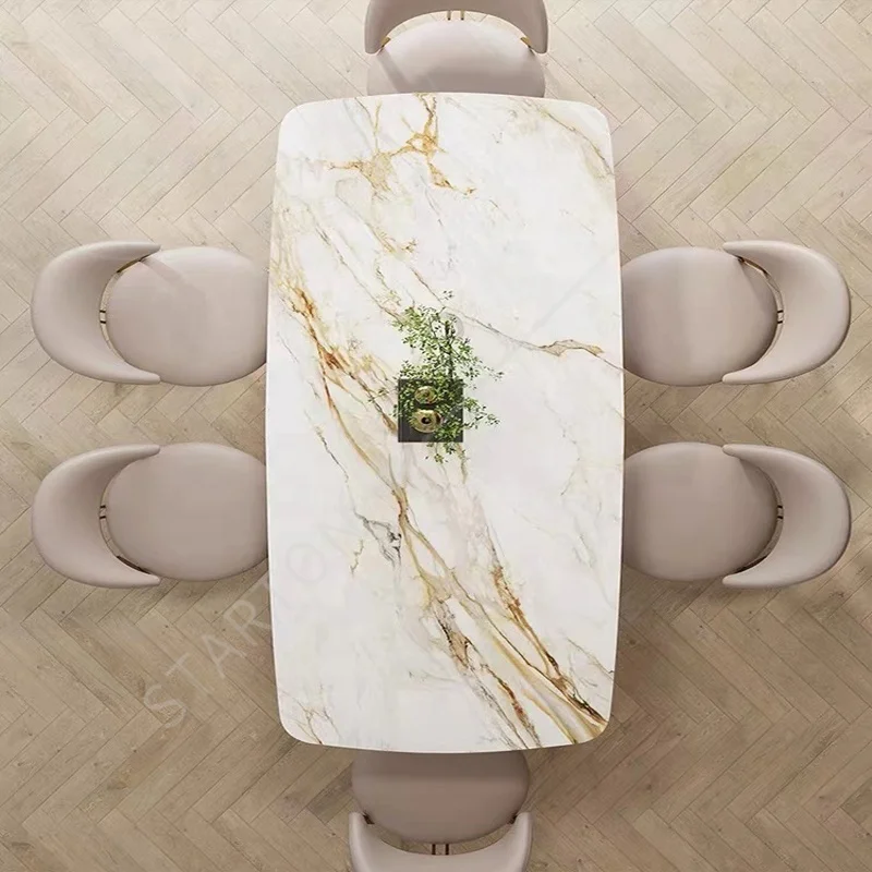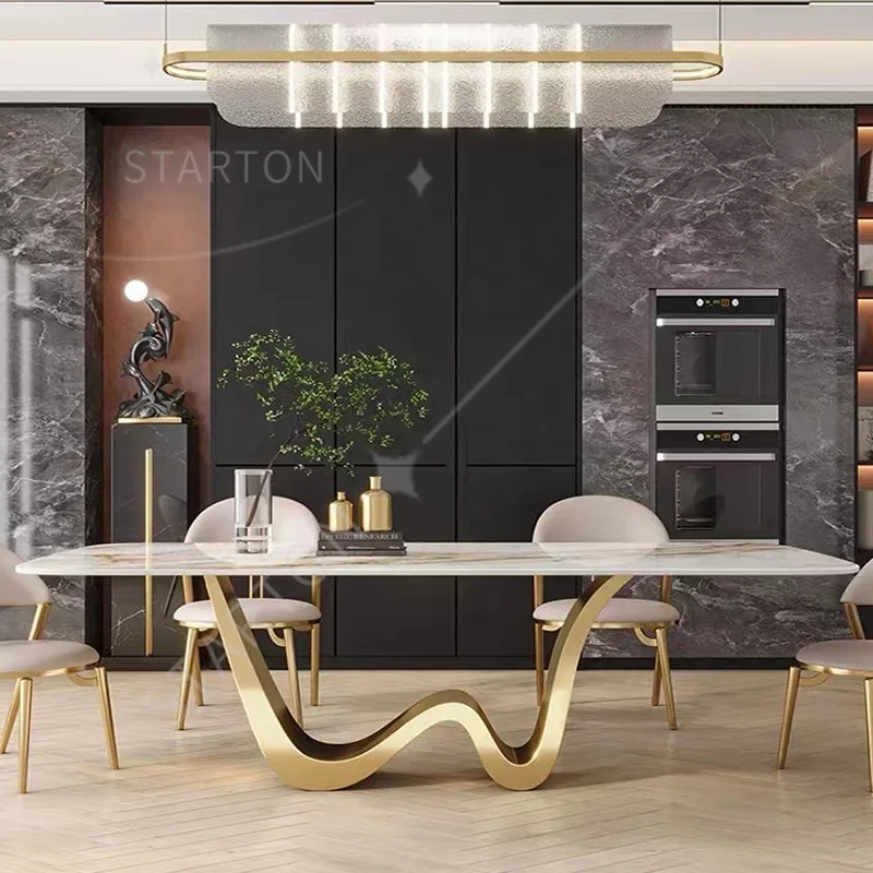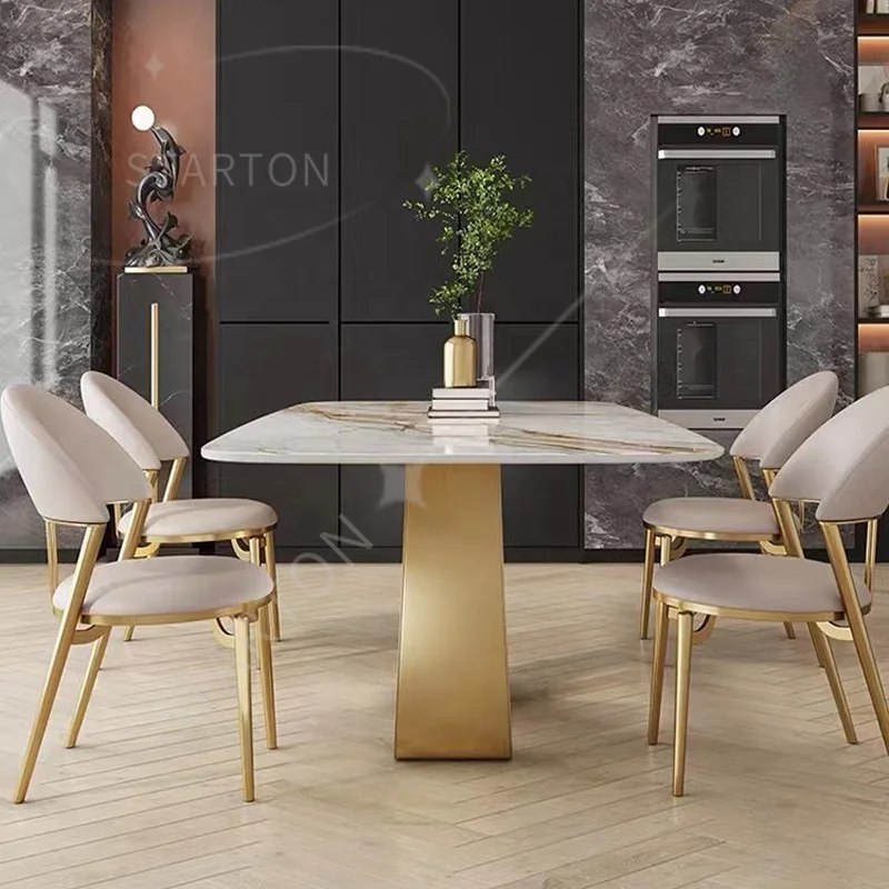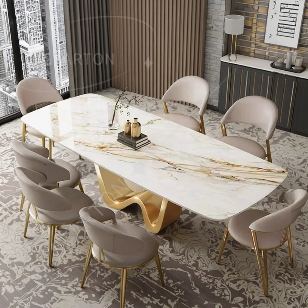 Modern Home Dining Table with Gold Stainless Steel Base Ceramic Top Rectangular Design for Luxury Home Hotel or Apartment Use