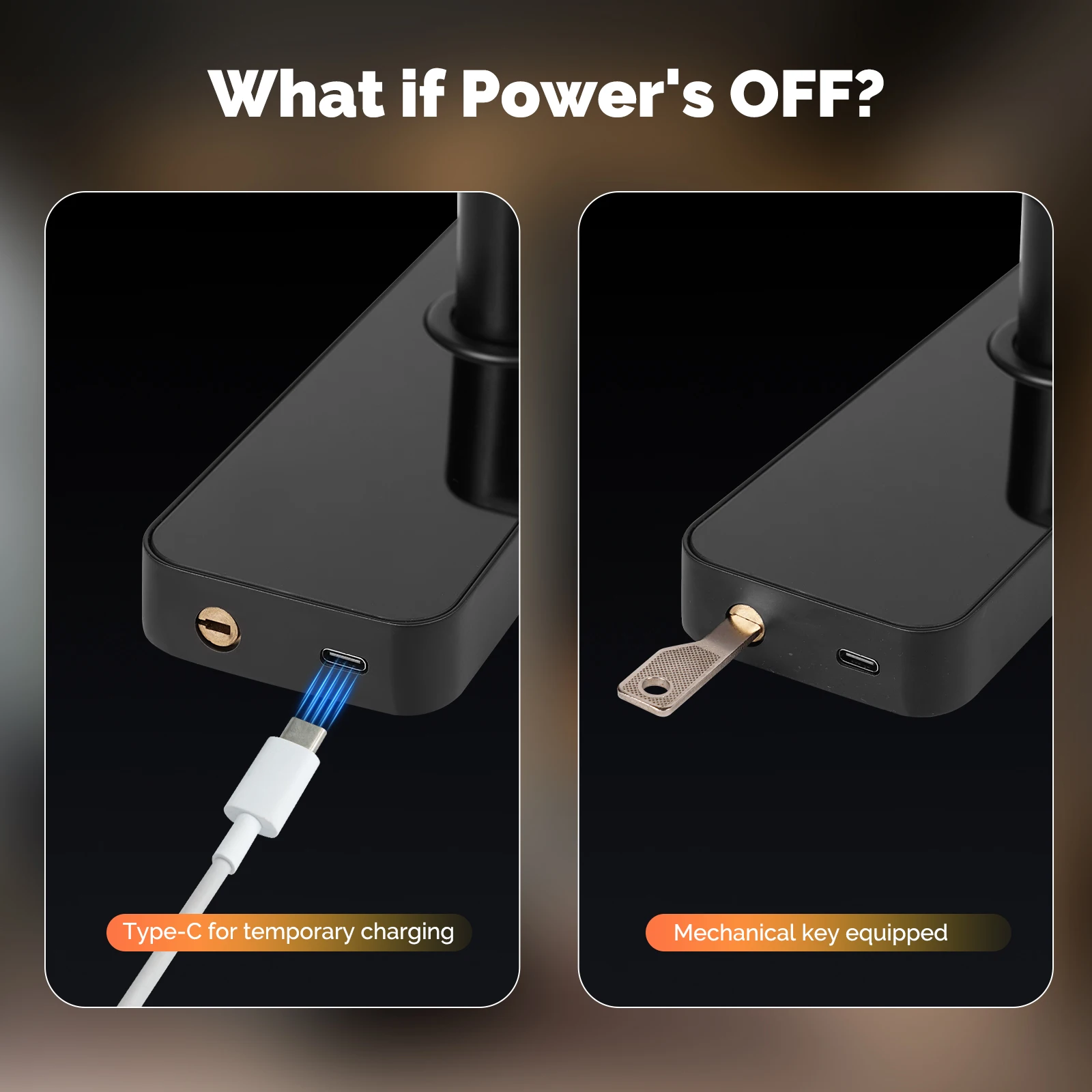 When the door lock battery just runs out, you can choose to temporarily charge it through the type-c port on the door lock, or use a matched key to open the lock.