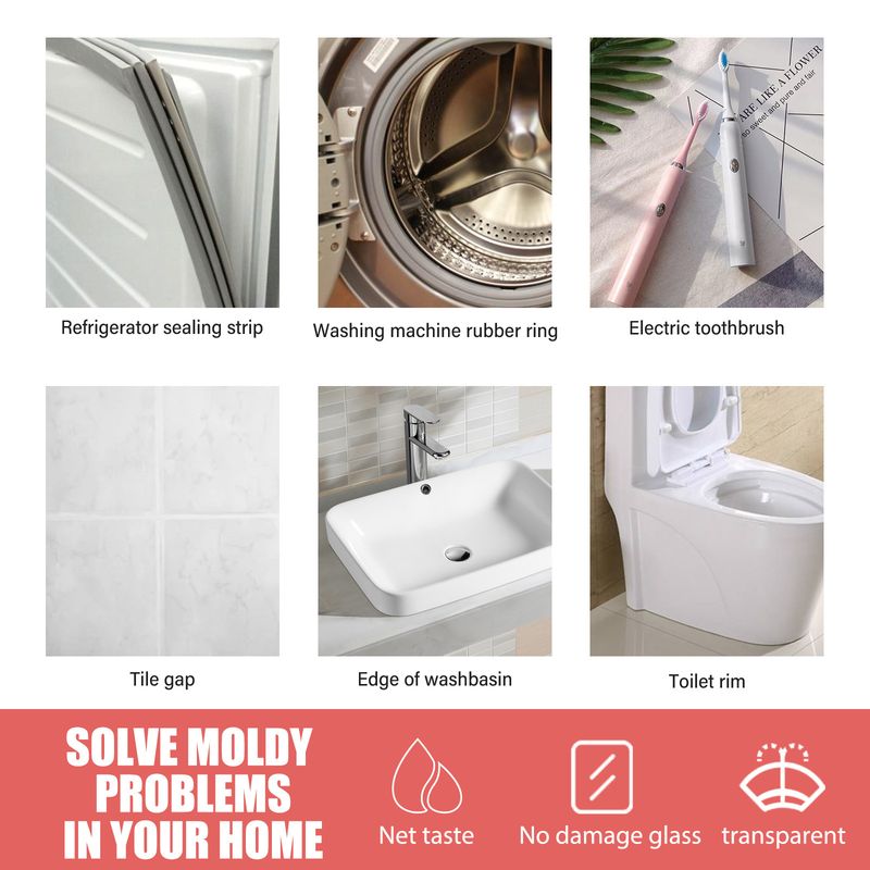 Suitable for damp and moldy areas such as kitchen sinks, tile gaps, bathroom walls, glass window frames, wall corners, as well as silicone sealing rings for refrigerators, washing machines, toilets, basins, bathtubs, etc., comprehensively solving the problem of home mold.