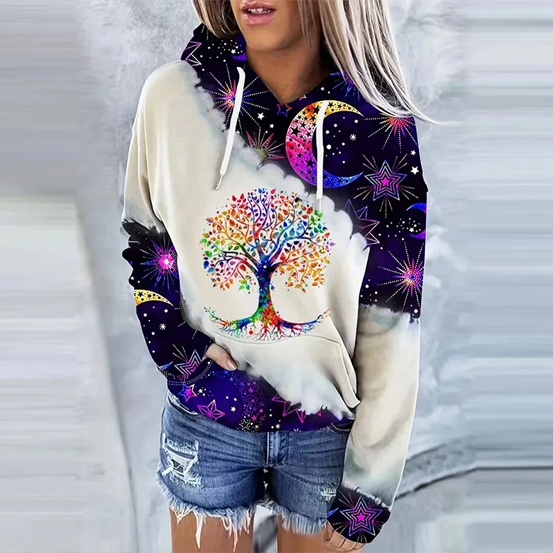 Moon Print Drawstring Hoodie Casual Long Sleeve Hooded Sweatshirt Women's Clothing
