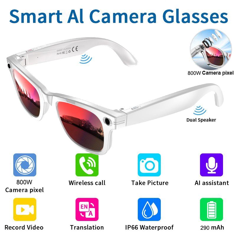Intelligent AI photo glasses with 800W camera for taking photos and recording videos, with intelligent translation capabilities. Bluetooth headphones, making calls, listening to music.