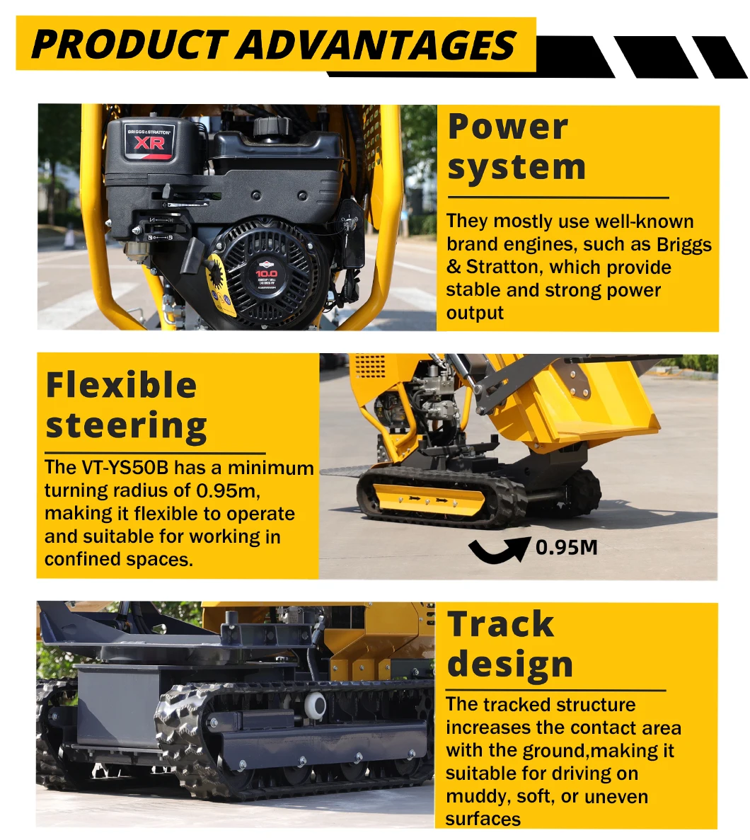 The detailed advantages of the mini dumper truck are as follows: including the power system, transmission system, braking system, chassis support system, hydraulic lifting system, cargo box and dumping system, etc.