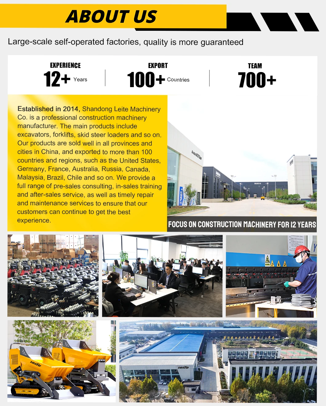 Established in 2014, Shandong Leite MachineryCo. is a professional construction machinery manufacturer. The main products include excavators,forklifts, skid steer loaders and so on. Our products are sold well in all provinces and cities in China, and exported to more than 100 countries and regions, such as the United States, Germany, France, Australia, Russia, Canada,Malaysia, Brazil, Chile and so on. We provide a full range of pre-sales consulting, in-sales training and after-sales service, as well as timely repair and maintenance services to ensure that our customers can continue to get the best experience.