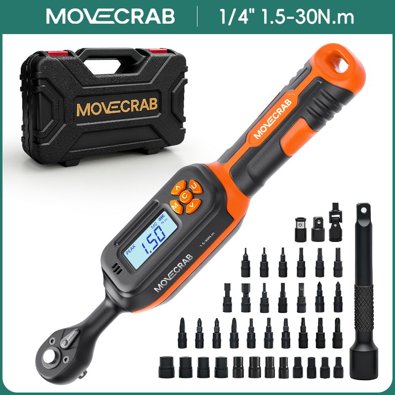 【40Pcs Professional Tools】This Bike torque wrench set includes: 1/4 drive digital torque wrench x1; Bit Socket x23: Phillips-PH1, PH2, PH3; Pozi-PZ1, PZ2, PZ3; Slotted-SL4, SL5.5, SL7; Torx-T10, T15, T20, T25, T30, T40; Hex-H2, H2.5, H3, H4, H5, H6, H8, H10; Shallow Socket x12: 4, 5, 5.5, 6, 7, 8, 9, 10, 11, 12, 13, 14mm; Adapters x4: 1/4" to 3/8" Adapter, 1/4" Hex Bit Holder, 1/4 Universal Joint, 4-inch Extension Bar, Comes with a protective storage case