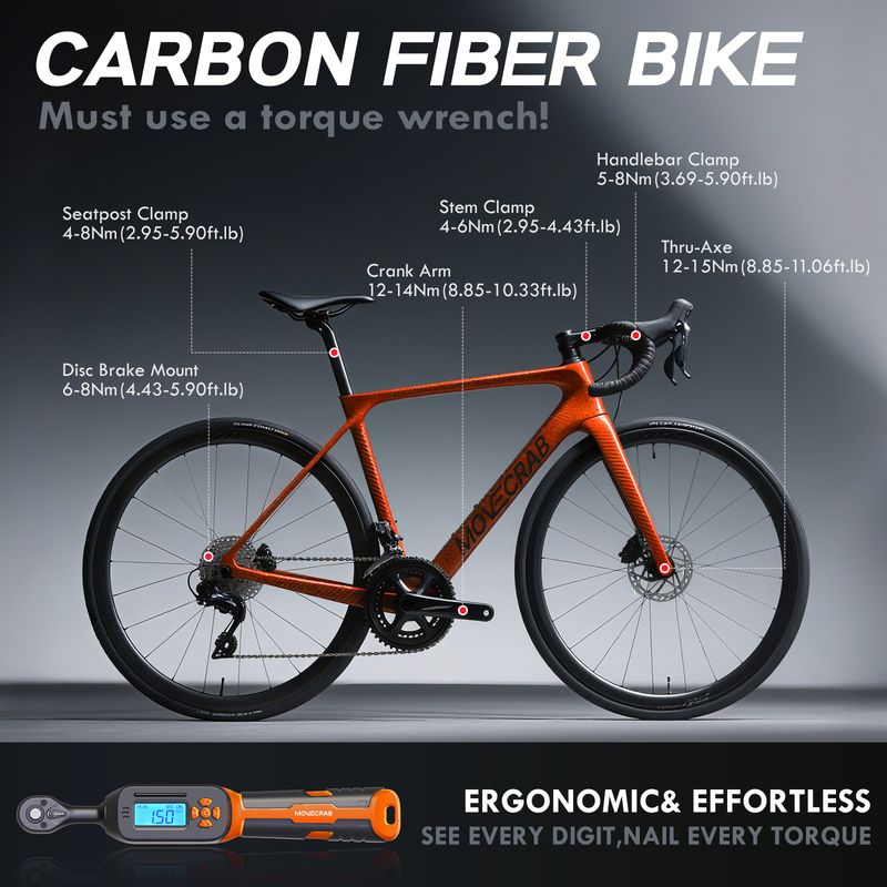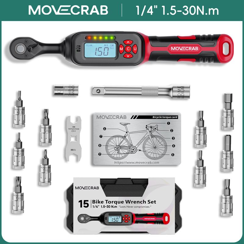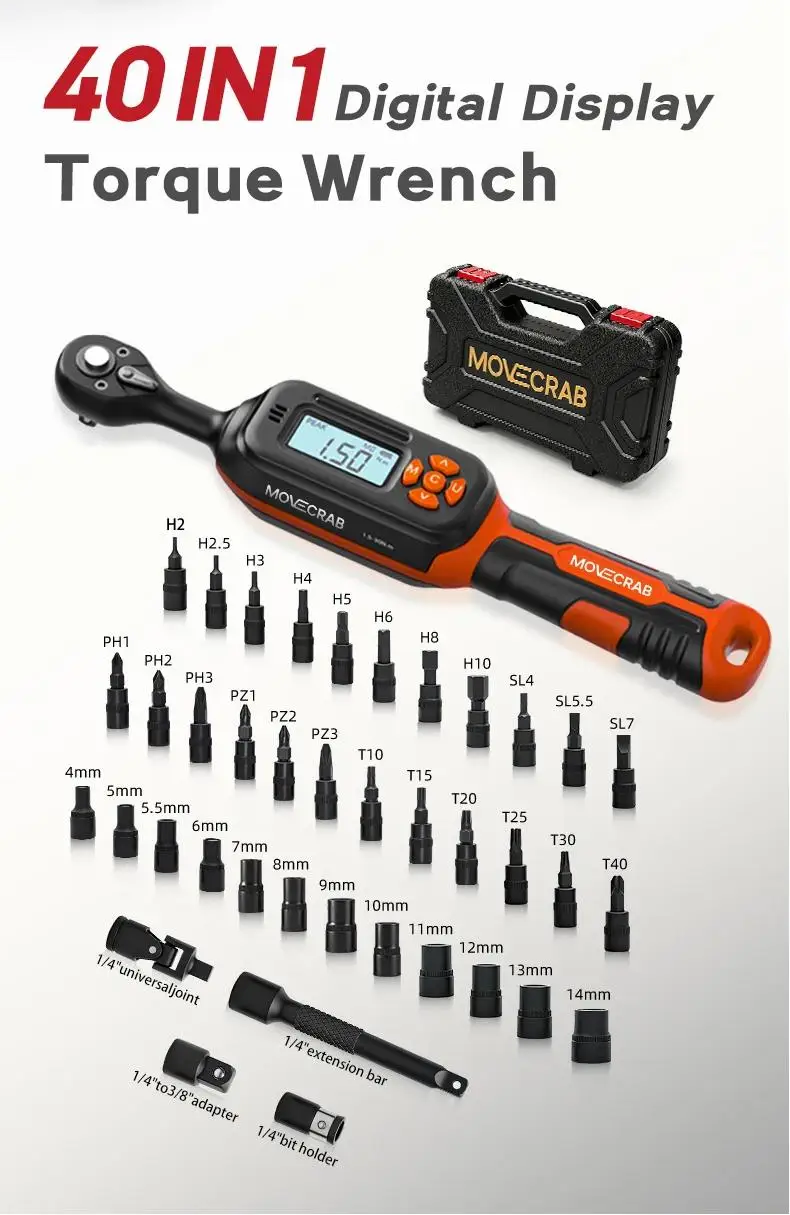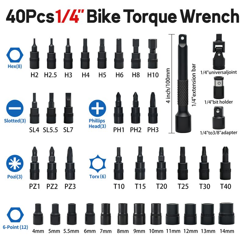 【40Pcs Professional Tools】This Bike torque wrench set includes: 1/4 drive digital torque wrench x1; Bit Socket x23: Phillips-PH1, PH2, PH3; Pozi-PZ1, PZ2, PZ3; Slotted-SL4, SL5.5, SL7; Torx-T10, T15, T20, T25, T30, T40; Hex-H2, H2.5, H3, H4, H5, H6, H8, H10; Shallow Socket x12: 4, 5, 5.5, 6, 7, 8, 9, 10, 11, 12, 13, 14mm; Adapters x4: 1/4" to 3/8" Adapter, 1/4" Hex Bit Holder, 1/4 Universal Joint, 4-inch Extension Bar, Comes with a protective storage case