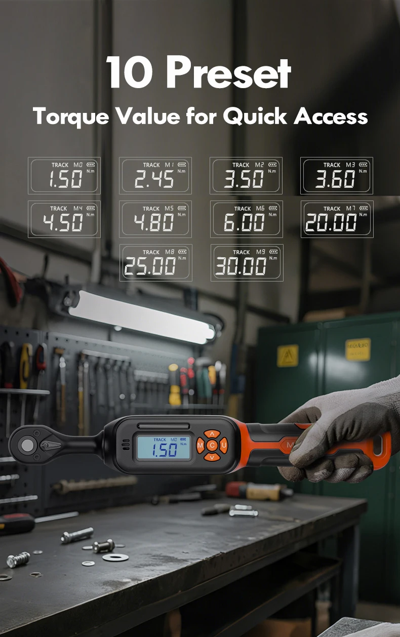 【10 Preset Modes & 4 Units of Use Switching】The digital torque wrench has been upgraded based on the market, offering 10 preset modes (M0-M9). In addition, torque value data can be automatically recorded after each use in peak mode, and up to 500 sets of data can be stored. Record the torque values of each of your work sessions, which can be viewed at any time, quickly and conveniently, improving work efficiency and quality