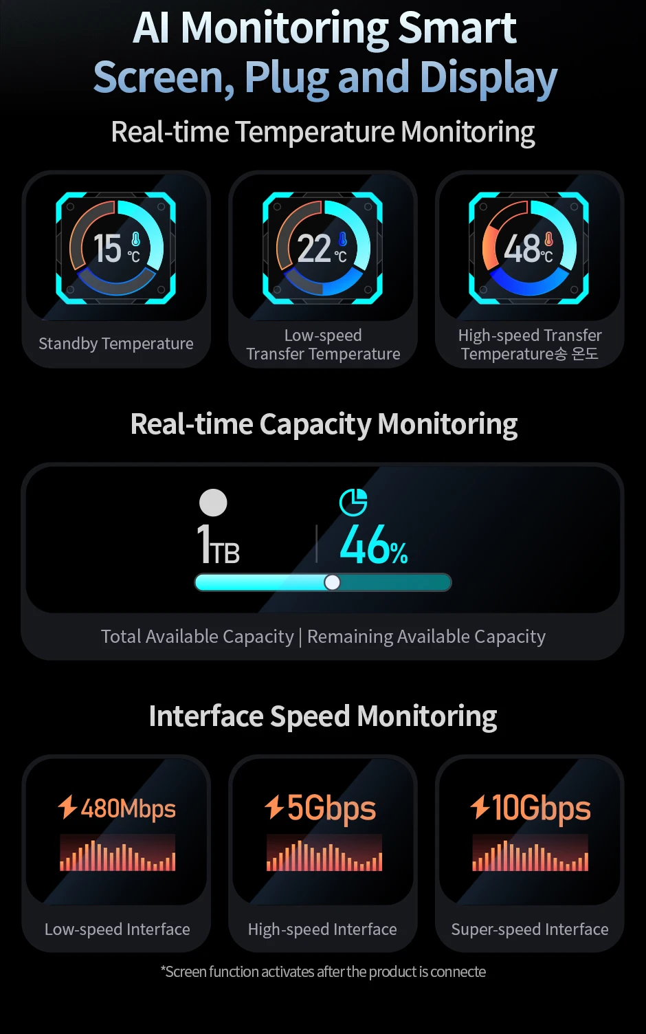 ■It is equipped with a dynamic screen to detect temperature, capacity (total capacity and remaining percentage) and connection interface speed in real time.