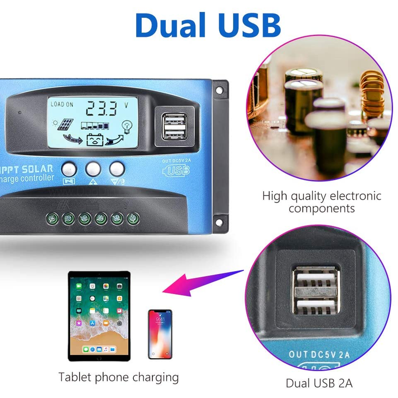 MPPT Solar Charge Controller 30A 40A 50A 60A 100A 12V 24V Auto Dual USB Load Discharger Solar Panel Regulator LCD Display