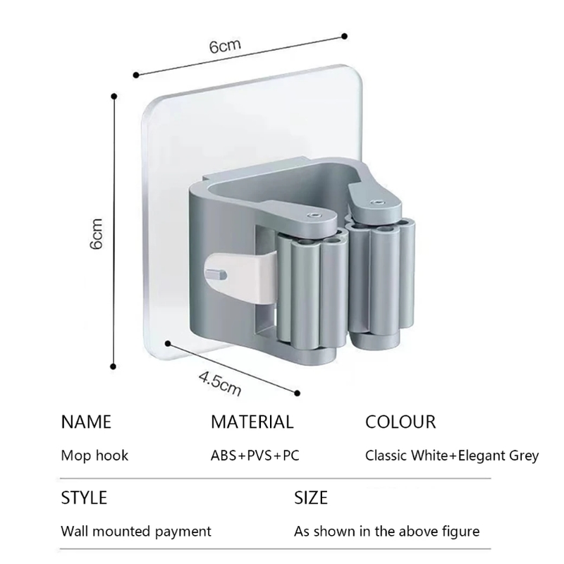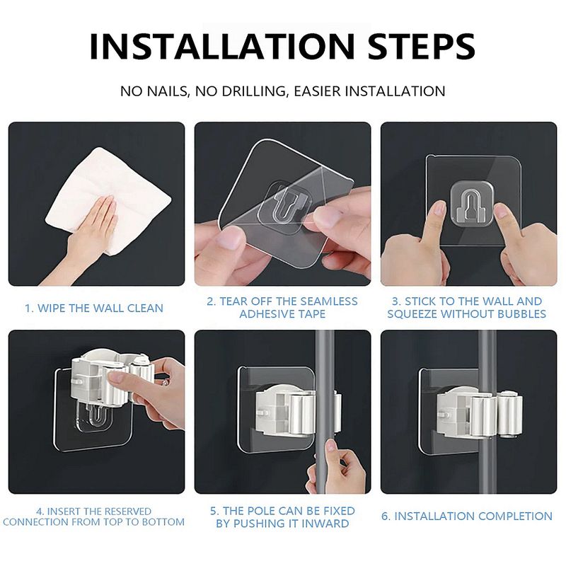 â‘£ Mop holder Easy installation: no tools or drills required, just peel and stick, no damage or stain on furniture and wall.