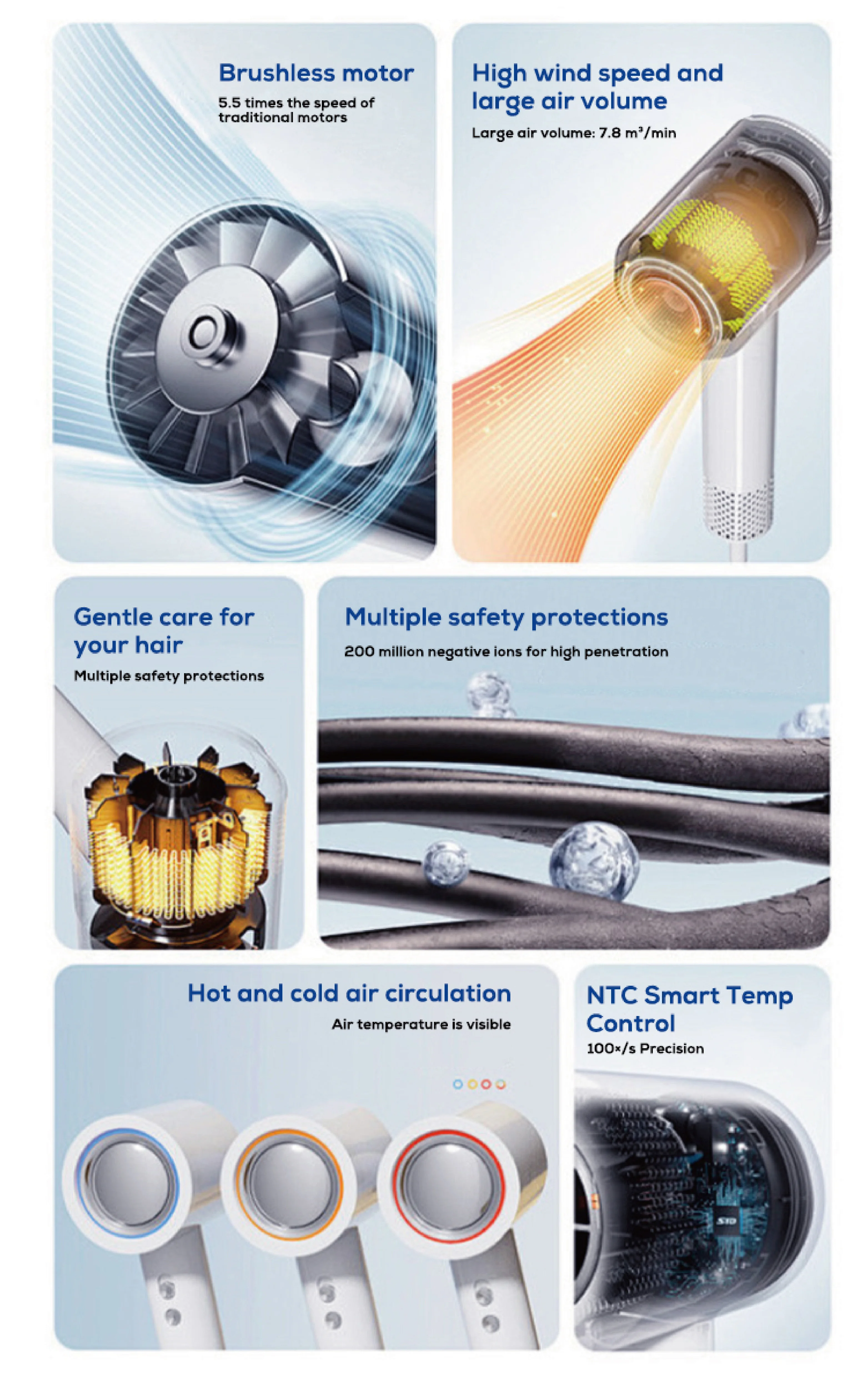 Refuse to Let Overheating Damage Your Hair:Upgraded Smart Temperature Control Our hairdryer, equipped with an advanced NTC temperature detector, monitors the air temperature over 110 times per second and regulates heat through a high-performance chip control system.