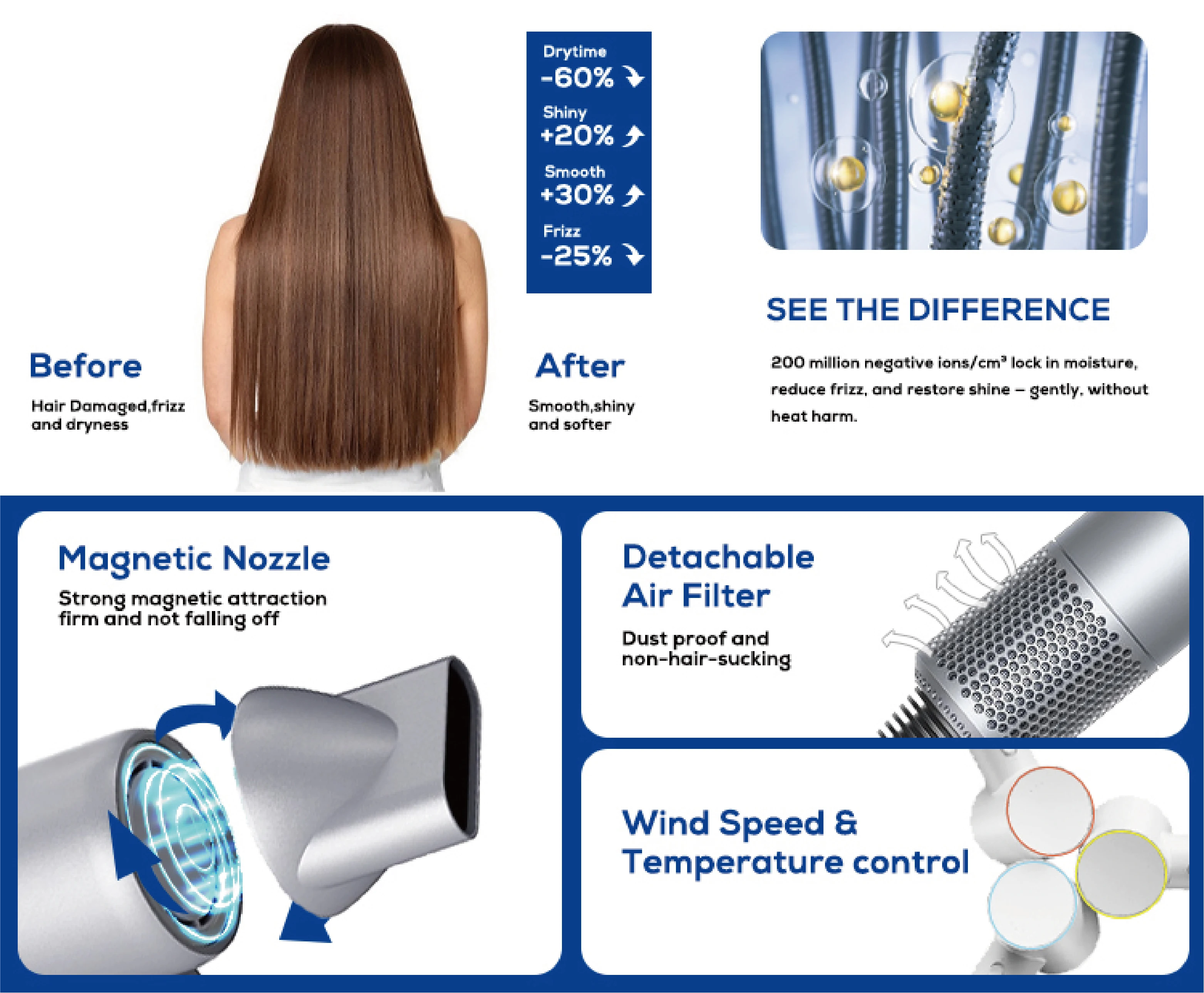Advanced Ionic Care for Silky-Smooth Hair: Our ionic hair dryer releases up to 200 million negative ions in seconds.