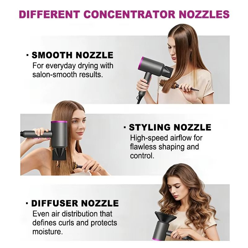 Versatile Nozzles: Includes Magnetic concentrator, diffuser, and smoothing nozzles for various styles.