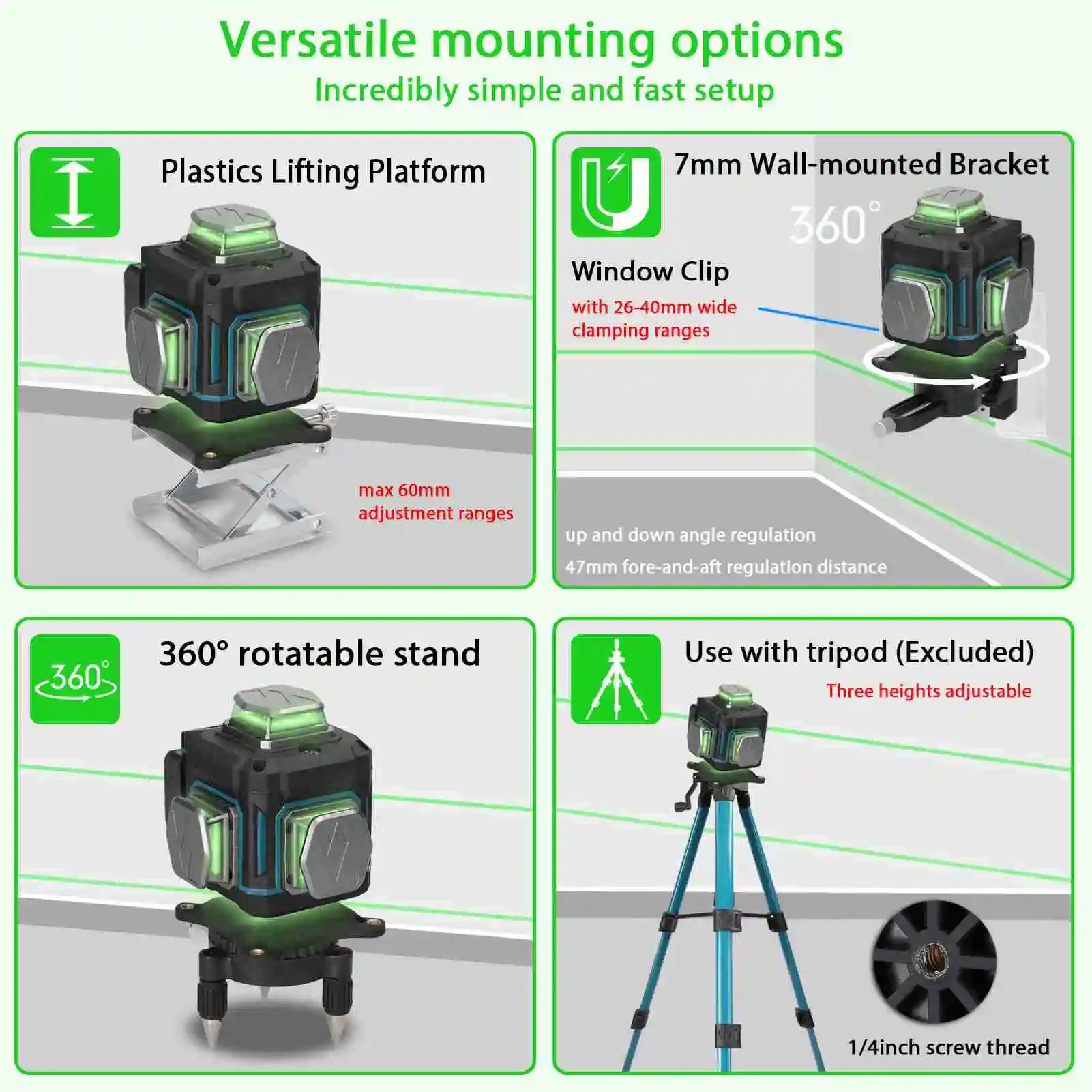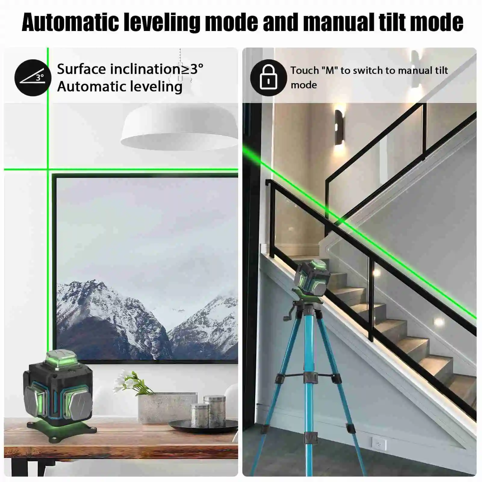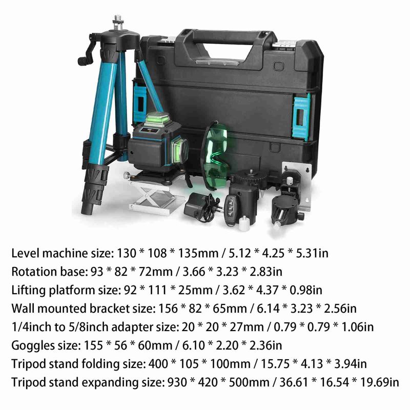 The level meter can emit 16 visible lase horizontal, vertical and oblique lines for the automatic leveling separately or simultaneously. Equipped with self test calibration function, ≤3° automatic leveling, but if the angle is over 3°, the light will keep blinking and the level will make a beep sound to remind you to reset them on a flat ground. Comes with one tripod bar, which is made of thicken aluminum alloy material, 3-heights adjustable, suitable to most of level with 5/8" interface. It provides accurate horizontal and vertical data for indoor construction stakeout and calibration, easy to operate and versatile. Suitable for flooring tile layout, paneling, wallpapering, stenciling, wainscoting, finish carpentry, wall stud layout and partition installation.Package List: