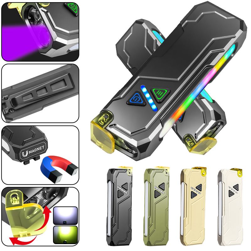 Features: Equipped with a yellow light cover that converts white light into yellow light, multiple colored side lights, a pen clip on the side, a magnet on the bottom, and a silicone tail rope