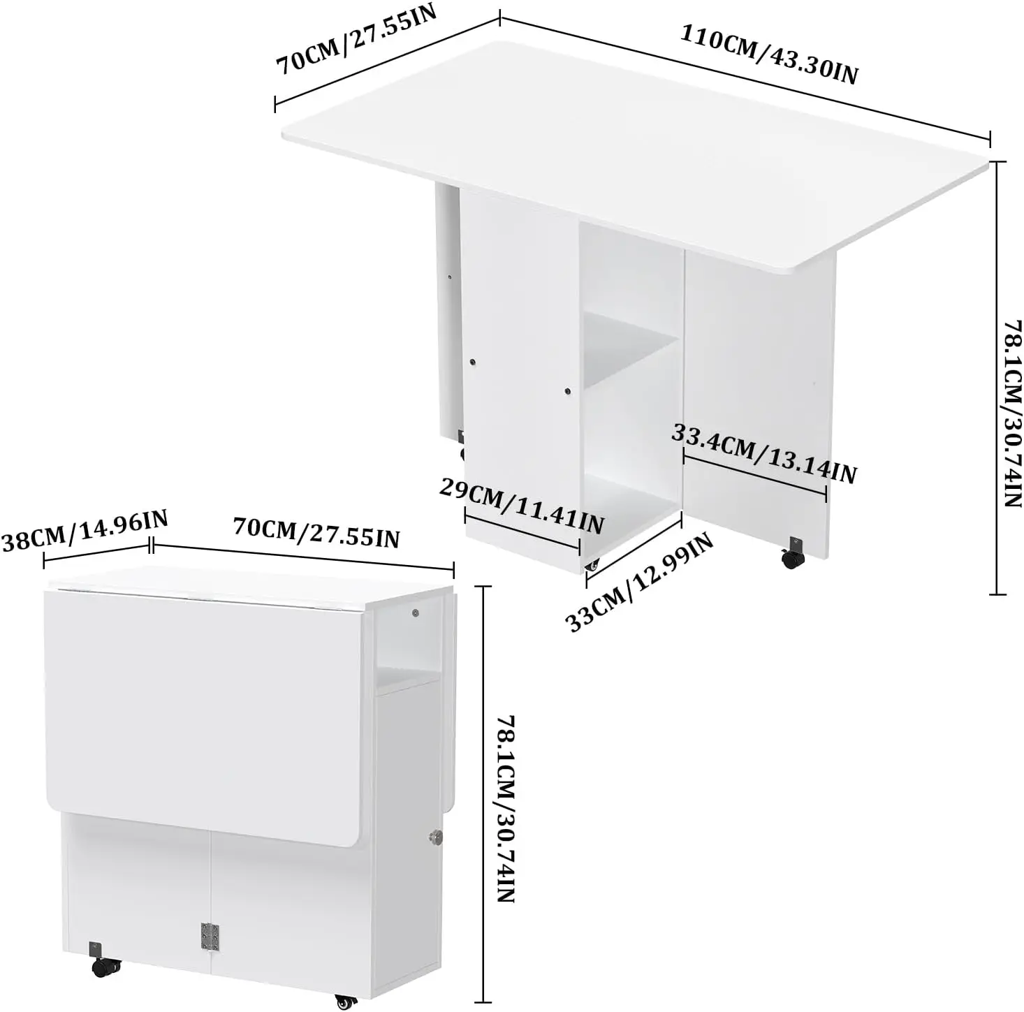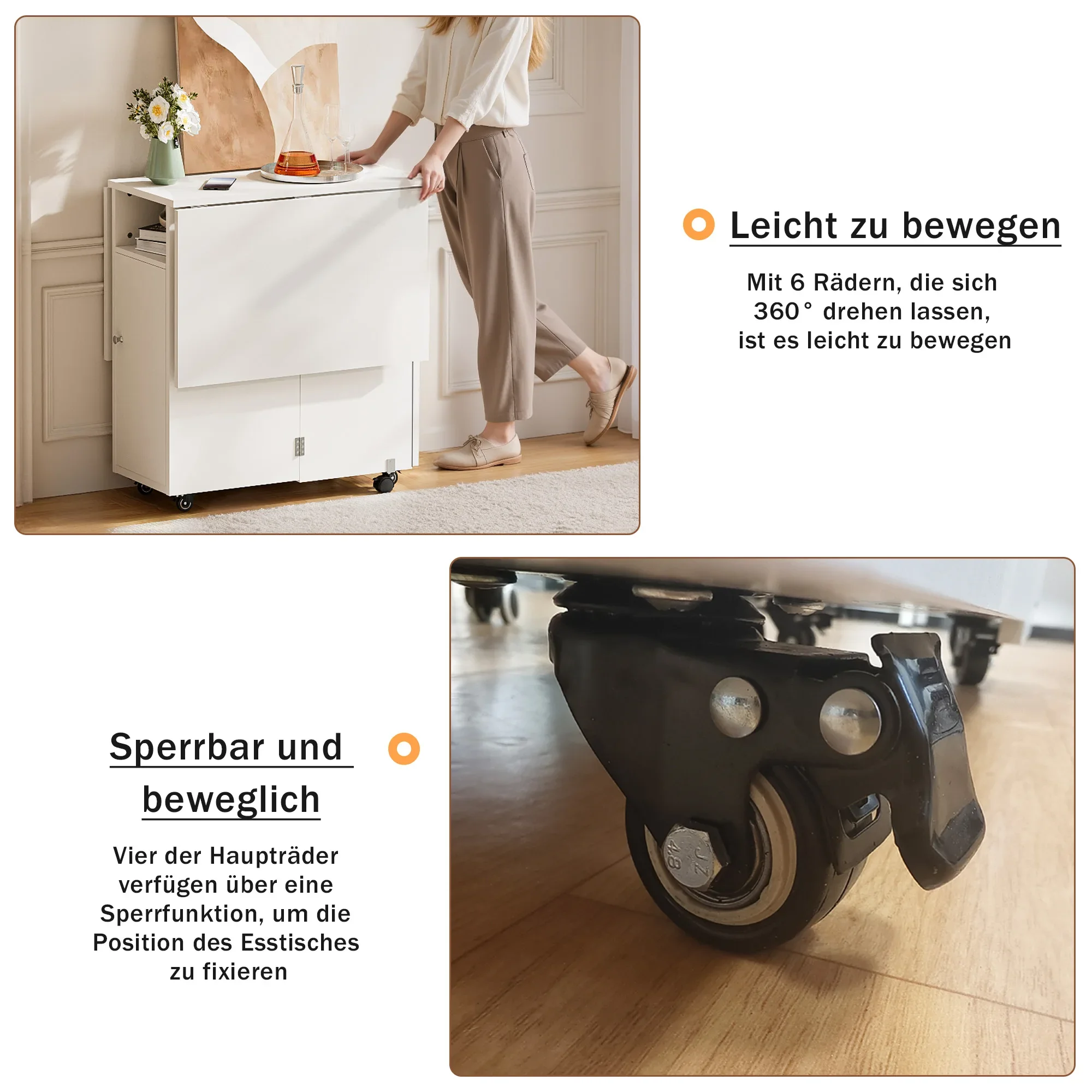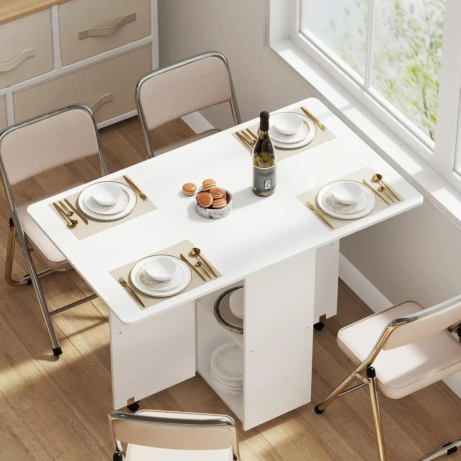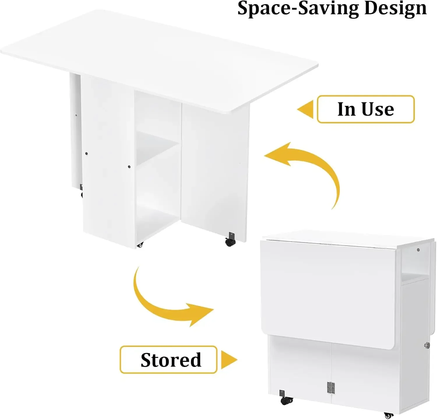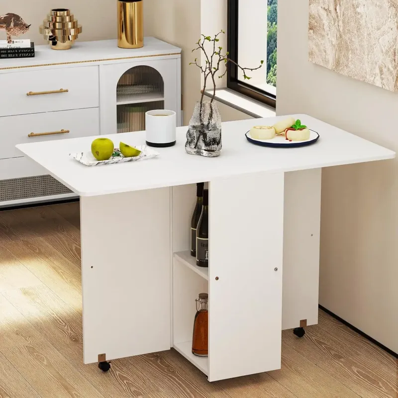Table with Wheels: Our folding table features smooth-rolling casters with locking mechanisms, allowing you to easily move it anywhere in your home. The sturdy wheels glide seamlessly across different floor types while maintaining stability when locked in place. Perfect for those who need flexible furniture arrangements in compact living spaces or multipurpose rooms.
