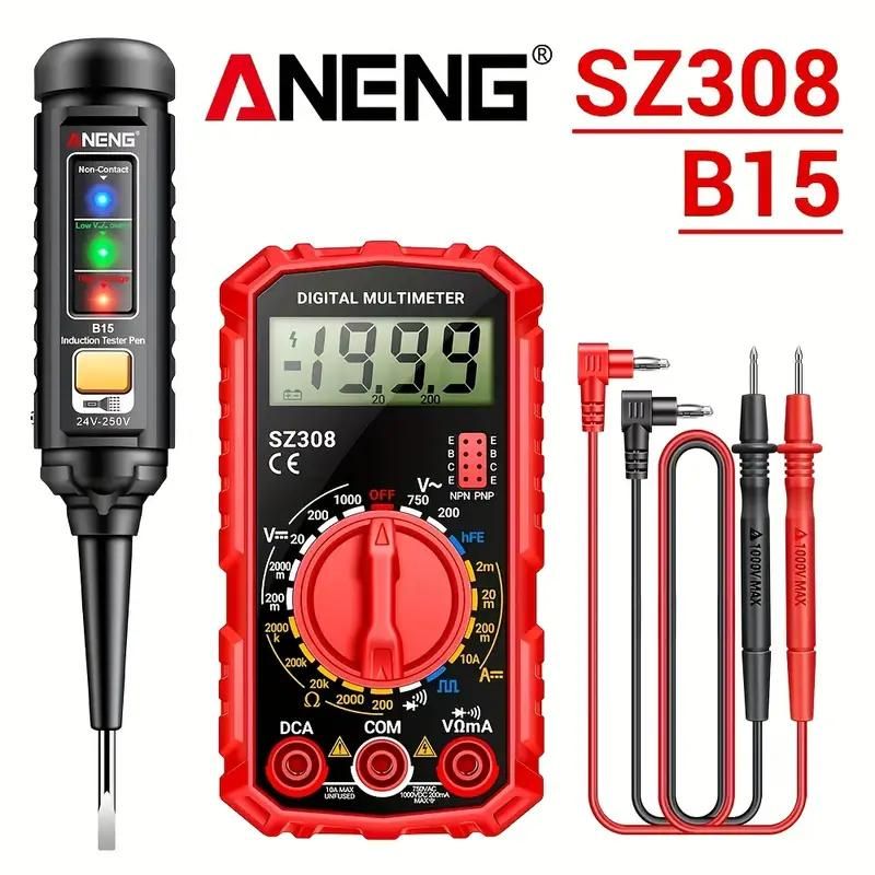 ANENG B15 SZ308 combo, voltage tester pen kit, non-contact AC detector, DC zero-firewire tester, line-breakpoint finder, 1999 counts multimeter, 1000V DC 750V AC DMM, 10A current meter, hFE transistor tester, square-wave output, beginner electrician set, home appliance repair tools, car EV wiring kit, pocket-sized DMM, anti-slip shell, buzzer diode test, high-precision meter, induction tester pen, light tester screwdriver, electrician gift set, DIY electrical starter kit, tool combo for students, HVAC quick-check kit