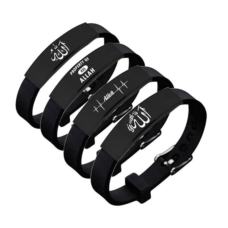 Muslim Allah Shahada Silicone Wristband Bangle Black Stainless Steel Adjustable Men Bracelet Islam Jewelry Accessories