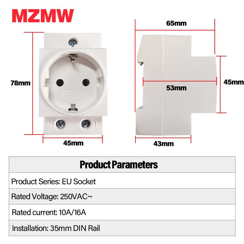 MZMW EU 35mm Modular Din Rail Power Socket Plug 10A 16A 250V AC Industrial Residential General-Purpose Adapter Connector CE