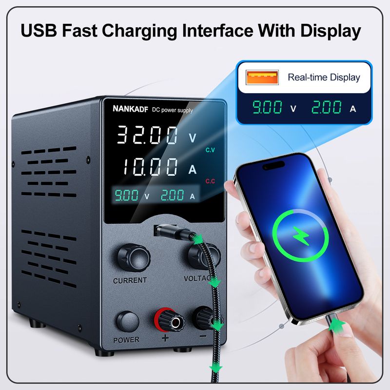 NANKADF DC Power Supply, 0-30V 0-5A 0-10A with High Accuracy 4-Digit LED Display, 5V/2A USB Port, Encoder Adjustment N-GA3010H
