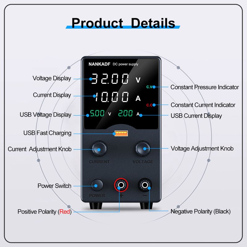 NANKADF's new series products. This model is a miniature switching DC power supply. The output voltage and current can be controlled and adjusted Encoder adjustment, so it provides more convenience and accuracy in the adjustment of voltage and current. The panel also provides high-precision two/three-window digital tube display of voltage, current , so that users can intuitively see the current use status and various parameters of the machine
