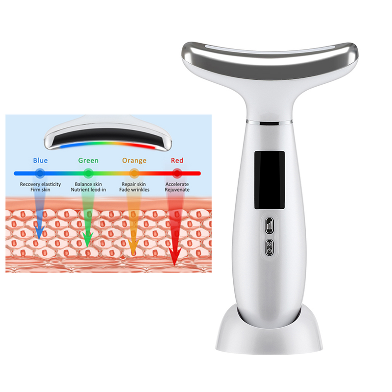 1. This neck face lifting massager features 7-color LED technology (Red Light: Stimulates collagen production. Orange Light: Relaxes skin & accelerates cell growth/healing. Green Light: Soothes and calms irritation. Yellow Light: Provides neutral lighting. Cyan Light: Reduces muscle twitching and capillary swelling. Blue Light: Improves microcirculation. Violet Light: Enhances lymphatic drainage.) to target different skin concerns for a more radiant and rejuvenated appearance.