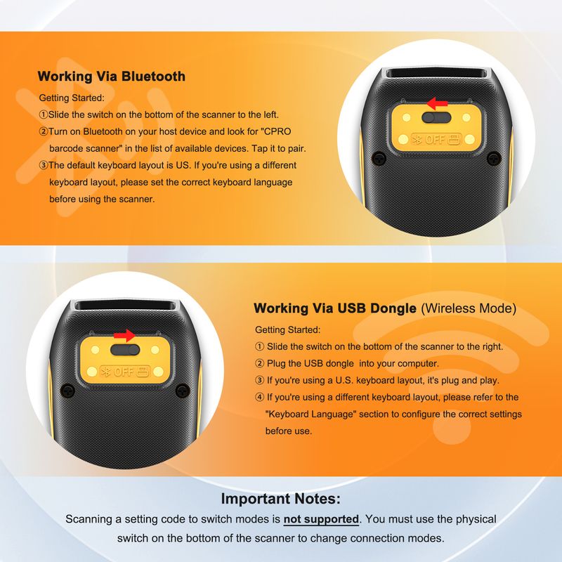 **3-in-1 Connections & Widely Compatible: -①Latest Bluetooth technology for wireless pairing with a variety of devices, -②2.4GHz Wireless Adapter for quick Plug & Play connectivity -③Wired USB Connection for stable and reliable data transmission, NETUM CS7501 wireless bluetooth barcode scanner can be connected to a variety of devices, such as smartphones, computers, POS, iPhones, iPads, and laptops.