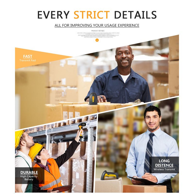 ćIndustrial Waterproof, Shock & Dust ProofćDust-proof, Splash-proof and Waterproof performance have reached IP67 level, With its rugged design and durable silicone plastic material, the NETUM NT-1200W is less likely to become damaged due to accidental drops from up to 12 ft./3.65 m. This barcode scanner with integrated housing which protect it from heavy dust, can handle mostly harsh working conditions.