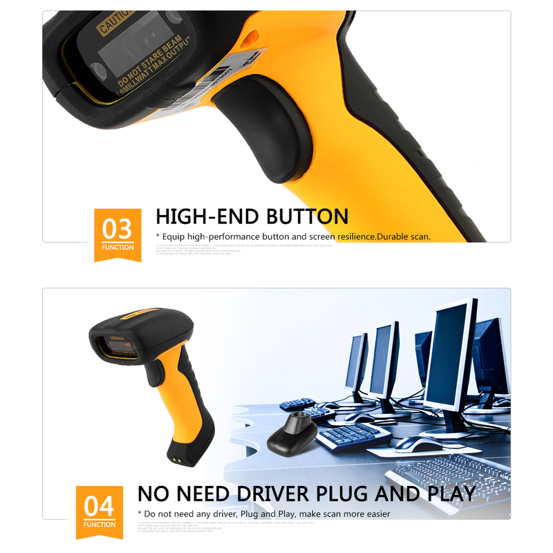 ćIndustrial Waterproof, Shock & Dust ProofćDust-proof, Splash-proof and Waterproof performance have reached IP67 level, With its rugged design and durable silicone plastic material, the NETUM NT-1200 is less likely to become damaged due to accidental drops from up to 12 ft./3.65 m. This barcode scanner with integrated housing which protect it from heavy dust, can handle mostly harsh working conditions.