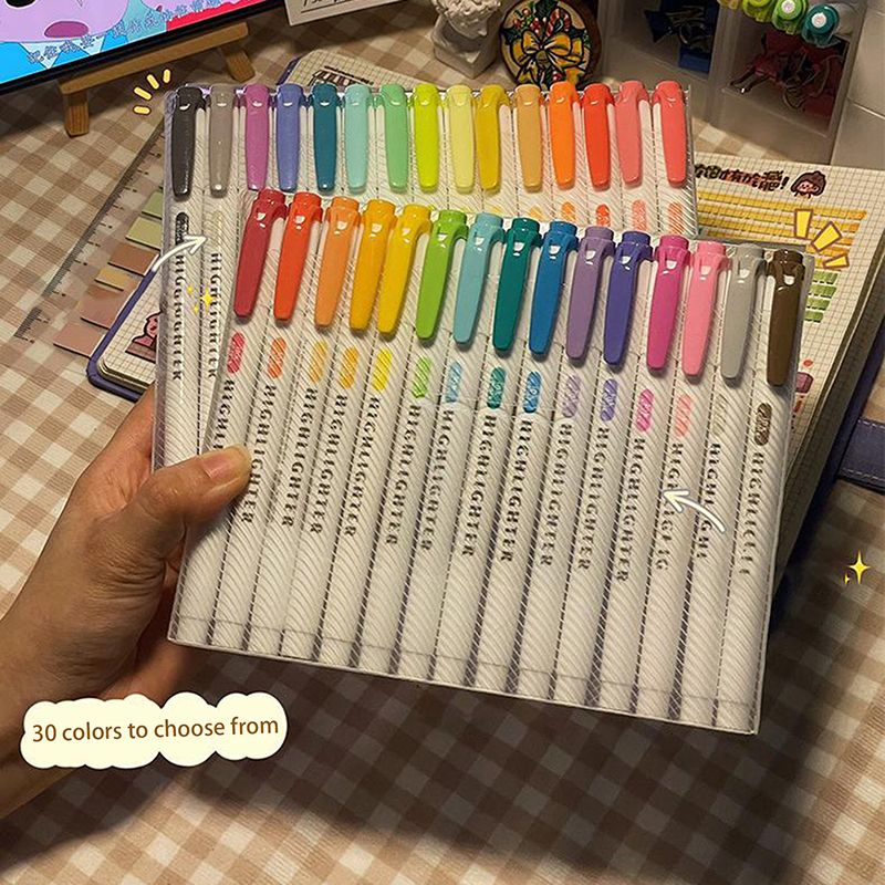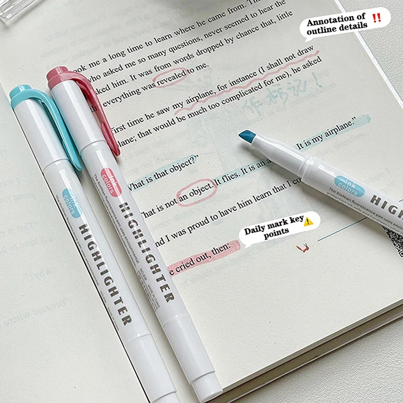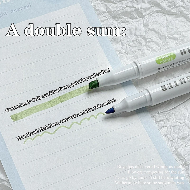1. Double-head design: The highlighter adopts a double-head design, one end is careful, suitable for marking and annotation, and one end is thick, suitable for coloring and emphasizing. Two kinds of pen, adapt to different use needs.