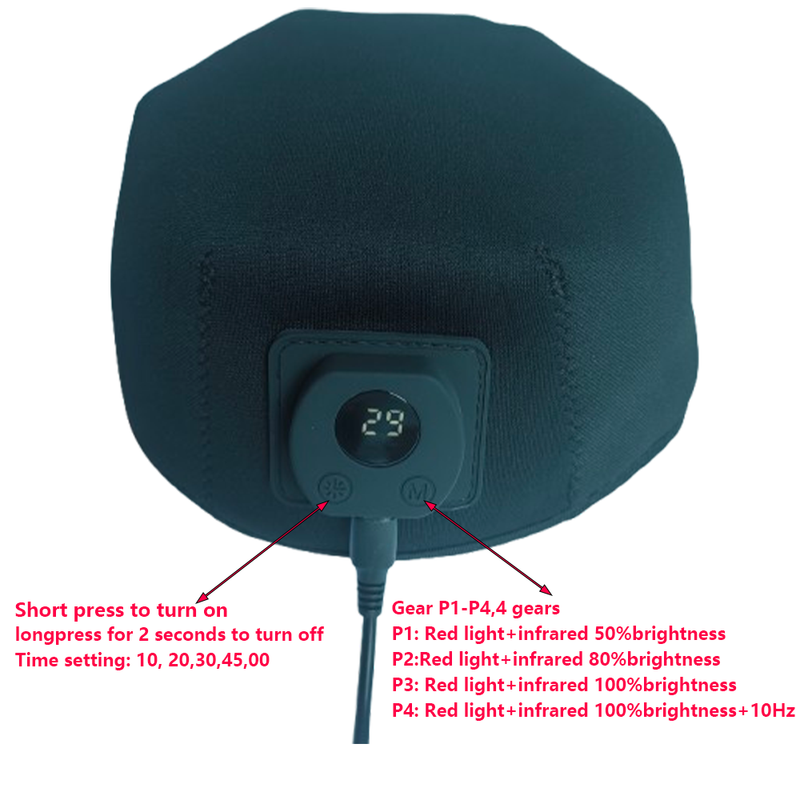 According to research, light with different wavelengths has different effects on the skin. Near-infrared rays can promote skin metabolism, eliminate inflammation, improve hair follicle blood circulation, and protect hair.Light board material - The light board is composed of skin-friendly material PU and non-woven fabric, which is light in weight and easy to install in the hat.Multifunctional timing device - The hair growth device has 4 mode adjustment modes, 10-minute and 25-minute minute timing device, so that you can easily use it even when you are sleeping, without worrying about excessive physiotherapy exposure.