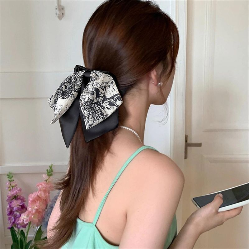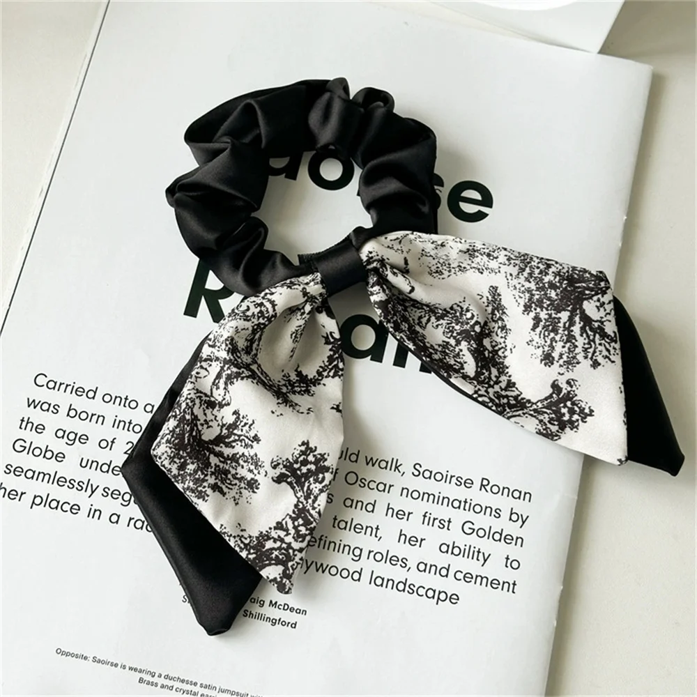 New Chinese Fashion Black White Flower Print Bow Ribbon Hair Ties Rope Rings Women Scrunchies Ponytail Elastic Hair Accessory