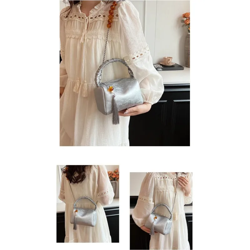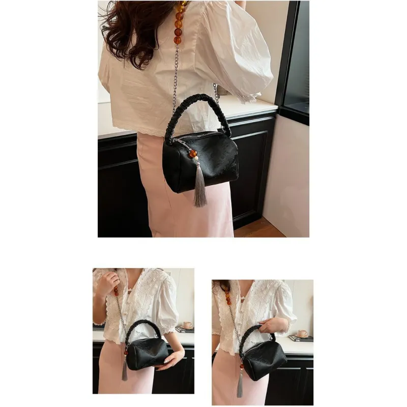 New Chinese Style Boston Shoulder Crossbody Bag Fashion Chain Design with Beaded Tassel Pendant