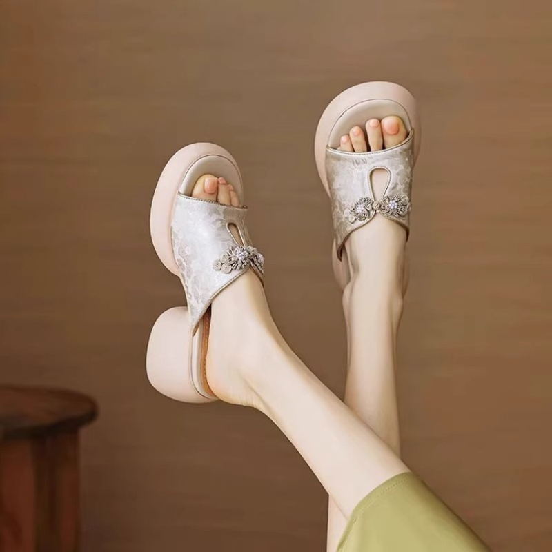 Chinese-style printed soft leather paired with handcrafted frog buttons, blending traditional Chinese aesthetics—retro, elegant, and infused with authentic Oriental charm. Available in two soft hues: bean green and light pink, both gentle and skin-flattering, perfect for spring and summer outfits. The platform wedge sole design visually adds over 5cm in height, sculpting your leg line while ensuring stable, fatigue-free walking. With an open-toe slide style, they’re easy to slip on and off, ideal for daily errands, commuting, vacations, and more.