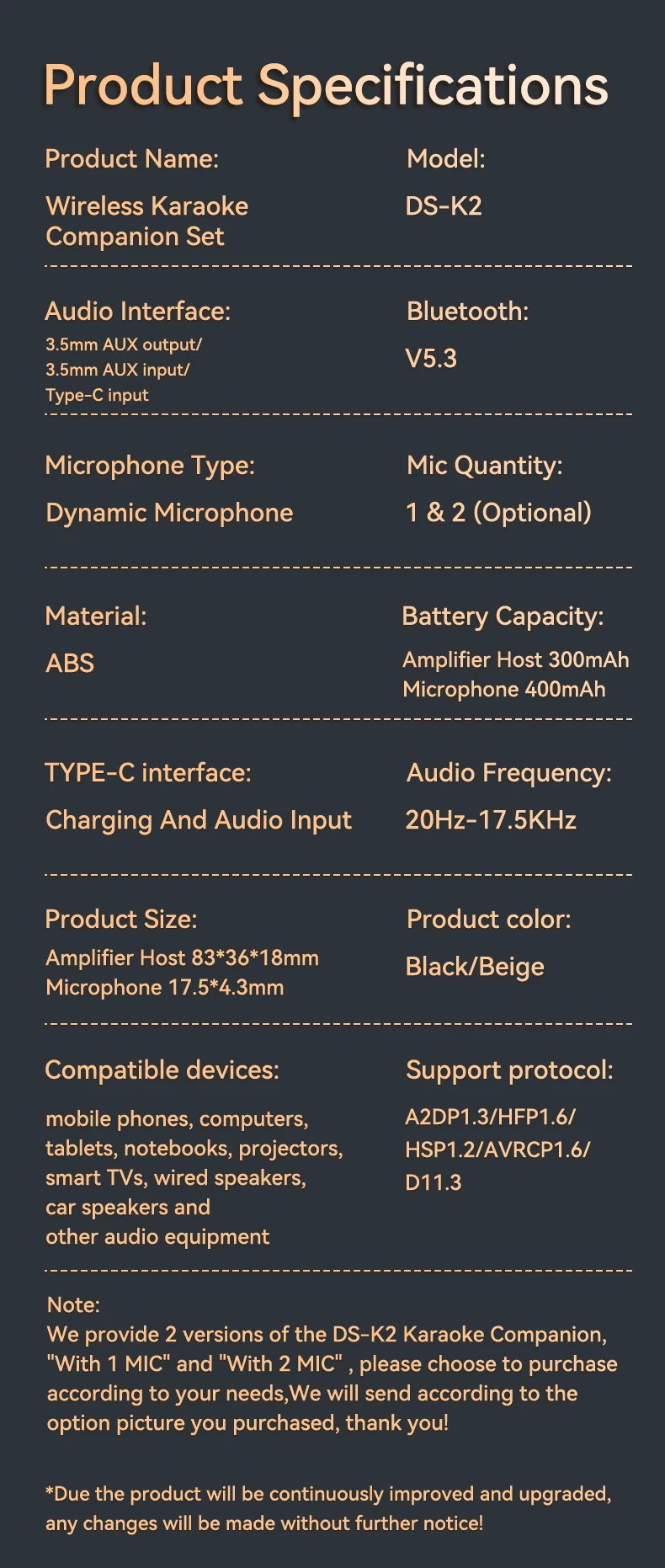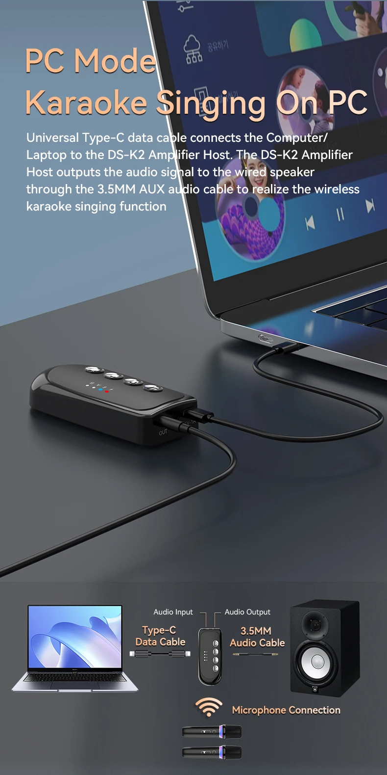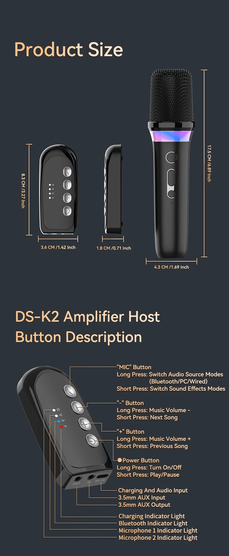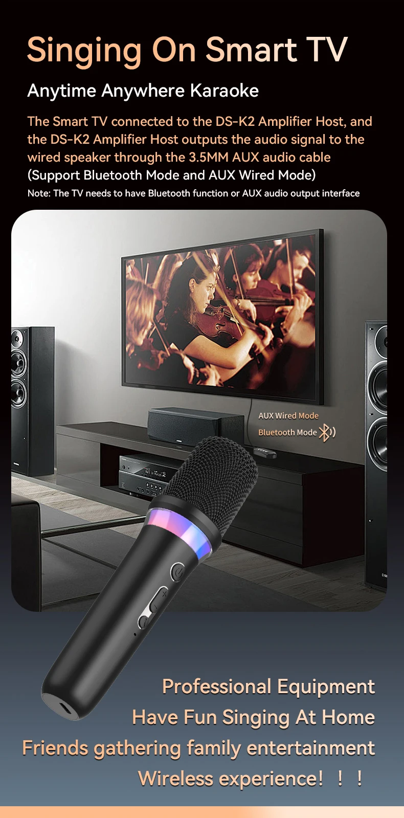 VAORLO DS-K2 Karaoke Companion Bluetooth 5.3 Wireless Moving-Coil Microphones RGB Colorful Light KTV DSP Mixer System 3.5MM AUX Type-C Amplifier Host HIFI Stereo Surround For Wired Speaker/Car Kit/PC/TV/Projector/Phone