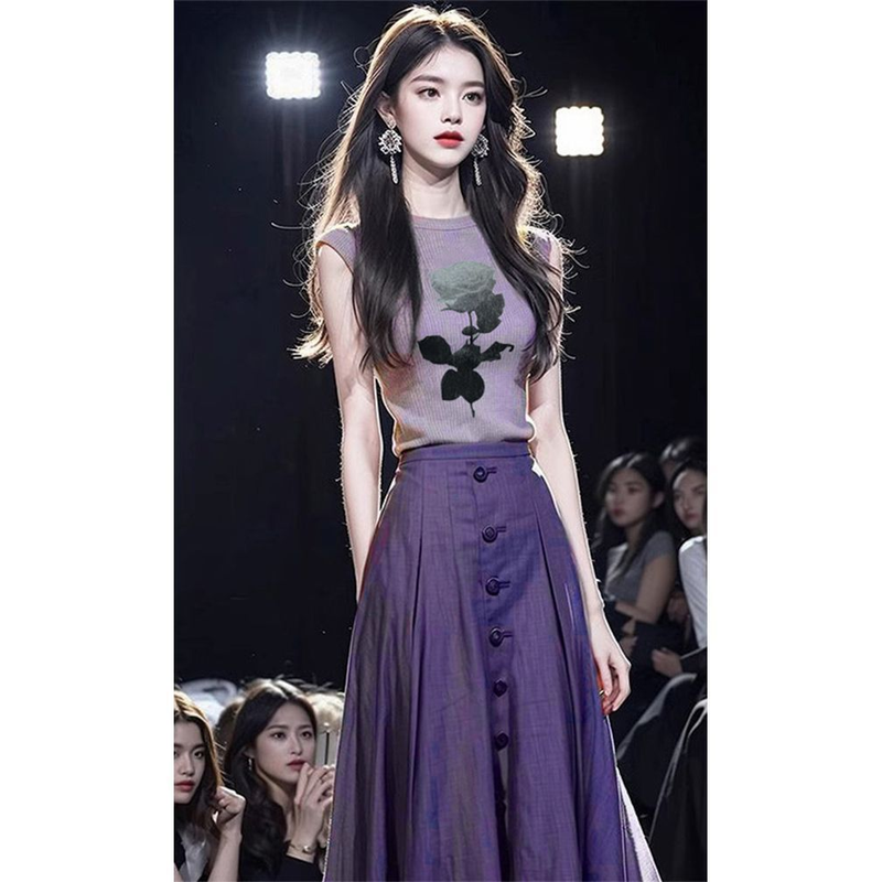 New High End Summer Two Piece Sets Women Outfit Floral Slim T-shirt Top + High Waist A-line Pleated Skirt Women's Suit